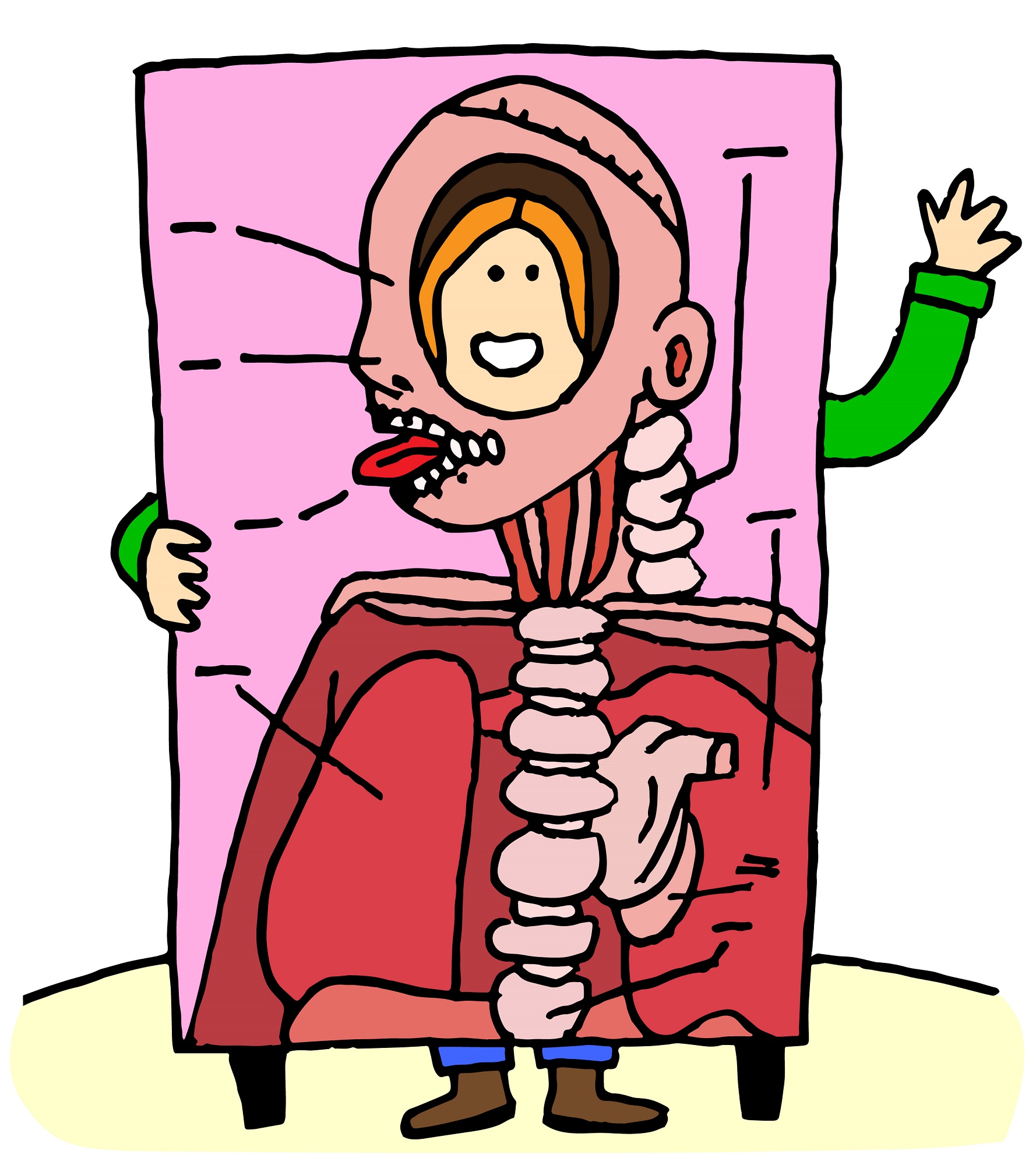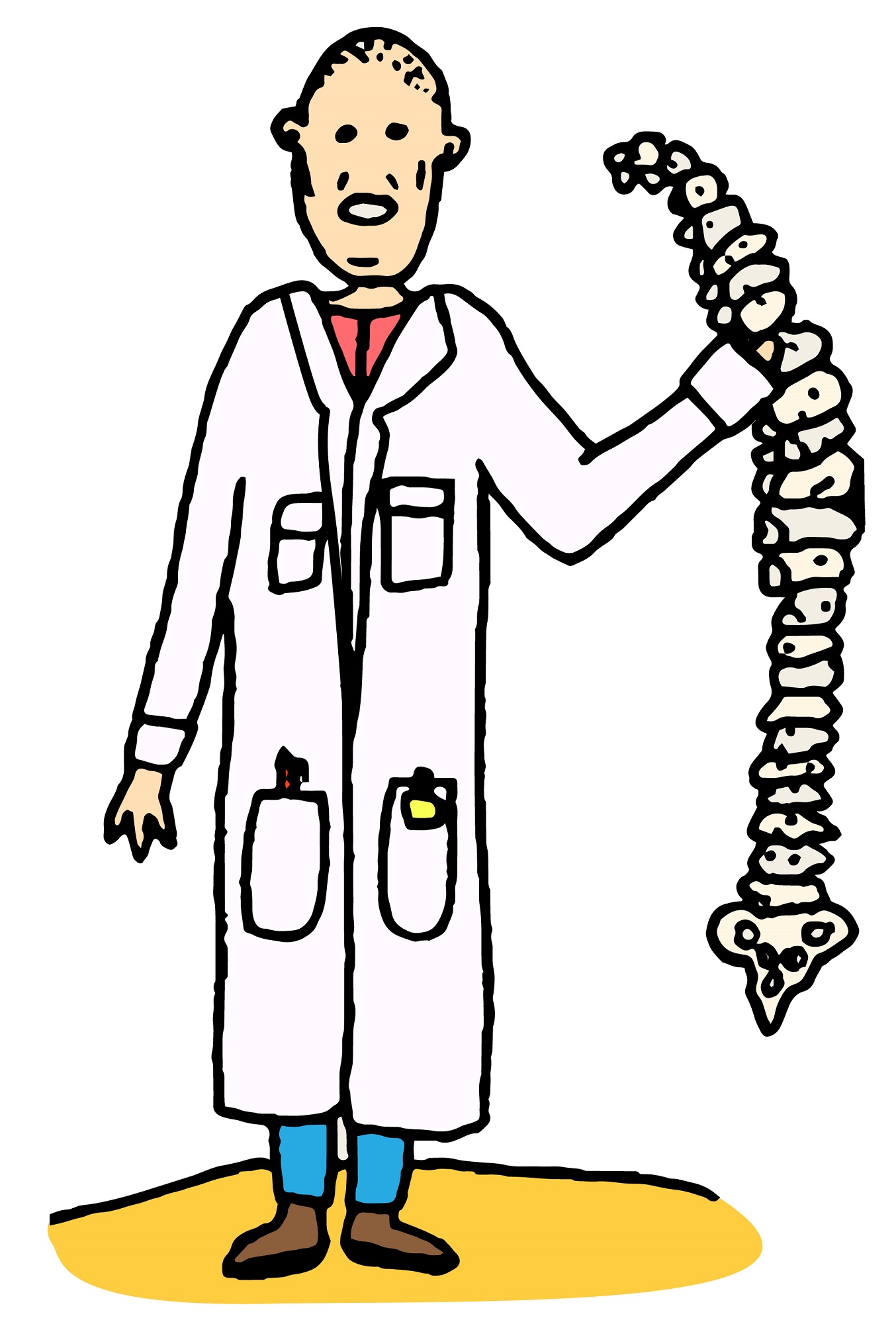 Docent Ruigrok: “De kyphosis en lordosis, bogen in de wervelkolom, vormen een soort veer. Op het moment dat je opspringt en weer neerkomt, zit daar een vering in. Als de wervels als blokjes op elkaar zouden staan, dan zou je veel meer slijtage krijgen. Kortom, de wervelkolom heeft een S-vorm zodat die minder makkelijk beschadigd wordt.”