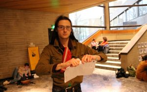 Filosofiestudent en Occupyer Thomas Kloos reageerde woedend toen hij het memorandum in zijn handen gedrukt kreeg. Ostentatief verscheurde hij zijn exemplaar en alle andere die hij in de zaal te pakken kreeg. Vervolgens beende hij richting de papierbak om ze daar te deponeren. “Ik vond het vrij absurd dat een bezette instantie als de EUR denkt regels te kunnen opleggen aan een protest. Ik snap wel dat ze het willen, maar wat ik niet snap is de toondoofheid waarmee het wordt gedaan. Het College van Bestuur spreekt constant met twee monden. Bij de eerste bezetting ontruimden ze eerst en wilden ze daarna het gesprek aangaan. En dat doen ze nu eigenlijk weer. Ze willen dat we om half elf weggaan, dus we weten allemaal hoe dat gaat aflopen. Dan worden we weer allemaal weggesleept.”