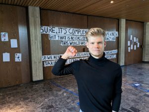 Psychologiestudent Charlie wil niet blijven slapen. “Ik verwacht dat we zo ontruimd worden.” Die kijkt met een goed gevoel terug op de dag. “Het is fijn dat het College van Bestuur er deze keer wel was.” Charlie benadrukt dat het goed is dat er meer aandacht voor hun eisen is en dat de universiteit werkt maakt van toegankelijkere gebouwen en duurzaamheidsbeleid. “Maar wij zijn niet zo onder de indruk van het uitroepen van de klimaatnoodtoestand. Er zijn meer maatregelen nodig. In dit tempo voorkomen we niet dat de universiteit in 2050 onder water staat.”