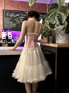Inmiddels is het redelijk druk binnen, met zo’n twintig leden en introducees. Sommige borrelaars hebben (vrij letterlijk) alles uit de kast getrokken en fantastische outfits aan, van driedelige prinsenpakjes tot roze prinsessenjurken.