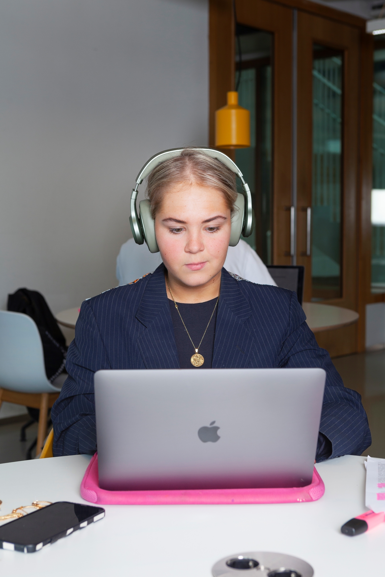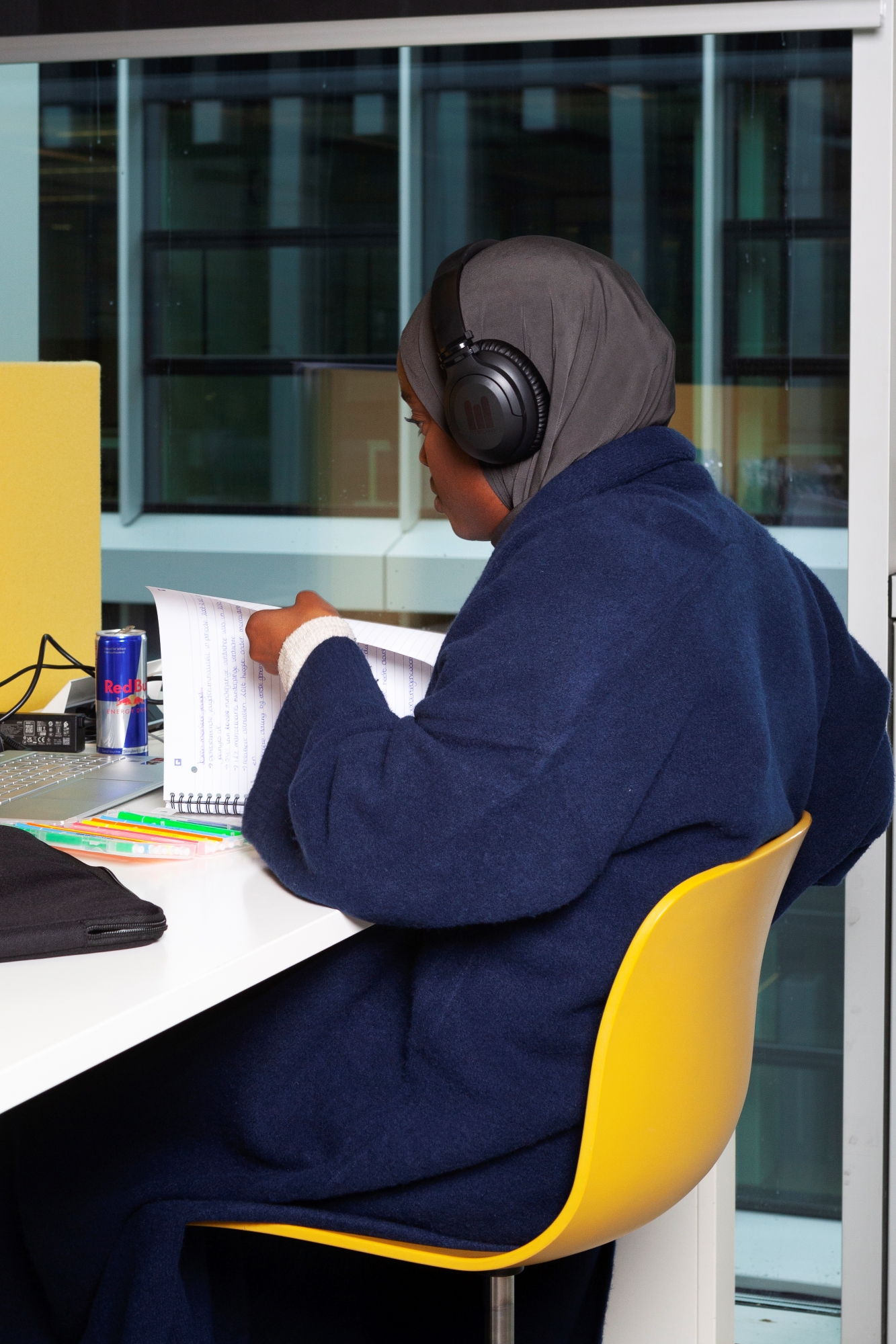 Geen naderende deadlines of tentamens voor Britt (20). De derdejaars Bedrijfskunde werkt momenteel ver vooruit. Ze is bezig met haar thesis. 20 maart is haar eerste deadline, 26 juni de laatste. “Over wat ik aandoe om te studeren, denk ik niet zo na. Oorbellen kunnen bijvoorbeeld uit als ze pijn doen door mijn koptelefoon. Wáár ik studeer kies ik wel bewust. De UB is voor als ik echt wil leren voor tentamens. Polak is voor als ik in het weekend niets gedaan heb, dan ga ik op maandag hierheen. Of als ik vooruit wil werken.”