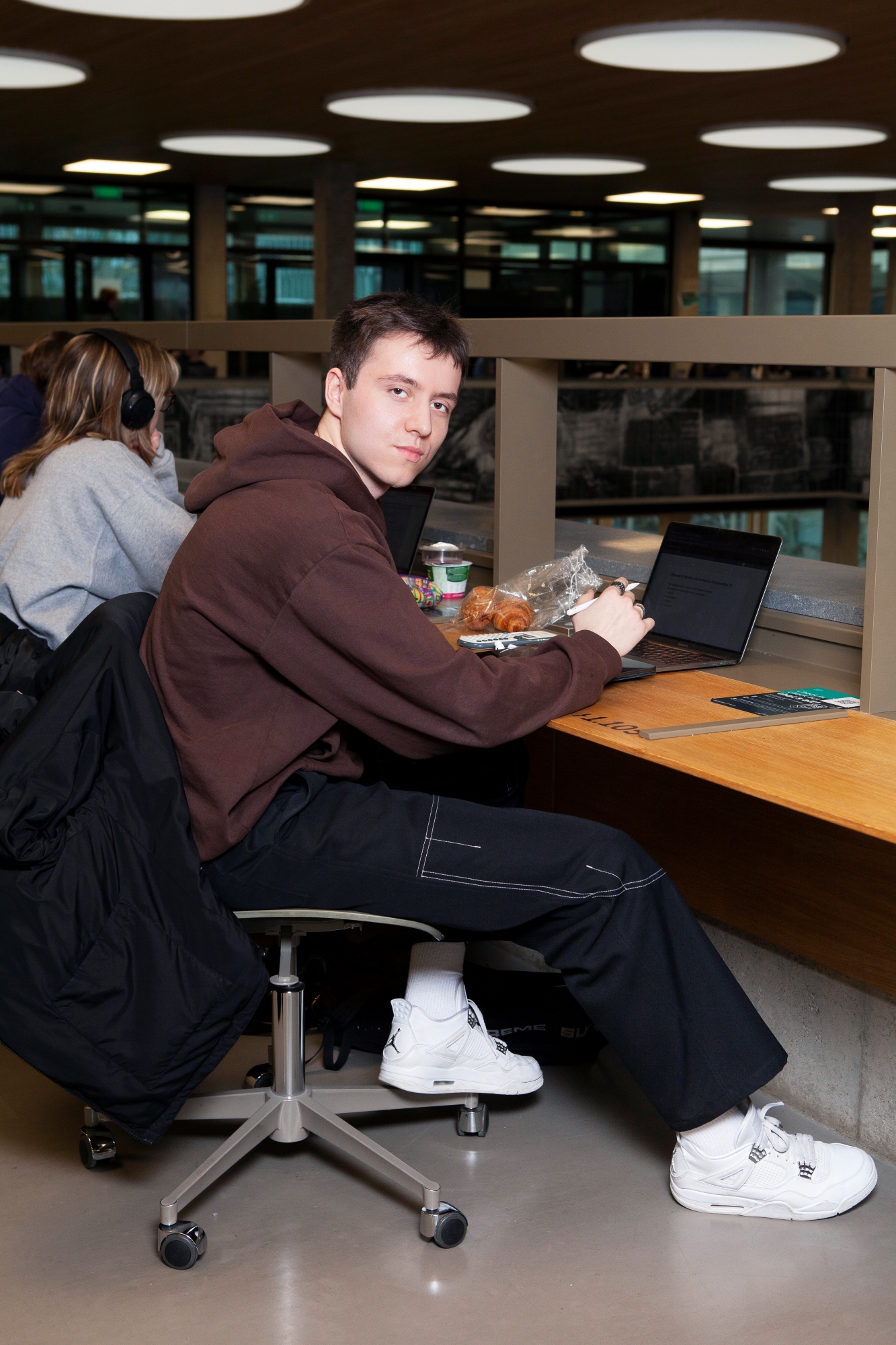 “Tentamens zijn net geweest. Het nieuwe, moeilijke blok bij Econometrie is net begonnen”, zegt de 20-jarige Clara. De tweedejaars International Bachelor Economics and Business Economics volgt op de vierde verdieping van Polak een videocollege. “Dit is mijn verdieping, hier ben ik vaak te vinden. De bibliotheek vind ik niet zo fijn, want de stoelen zitten niet prettig. Ik wil comfortabel studeren, daar kies ik ook de outfit en de snacks voor. Als lunch had ik een focaccia en een kaneelbroodje, die van de Spar zijn verrassend goed.”