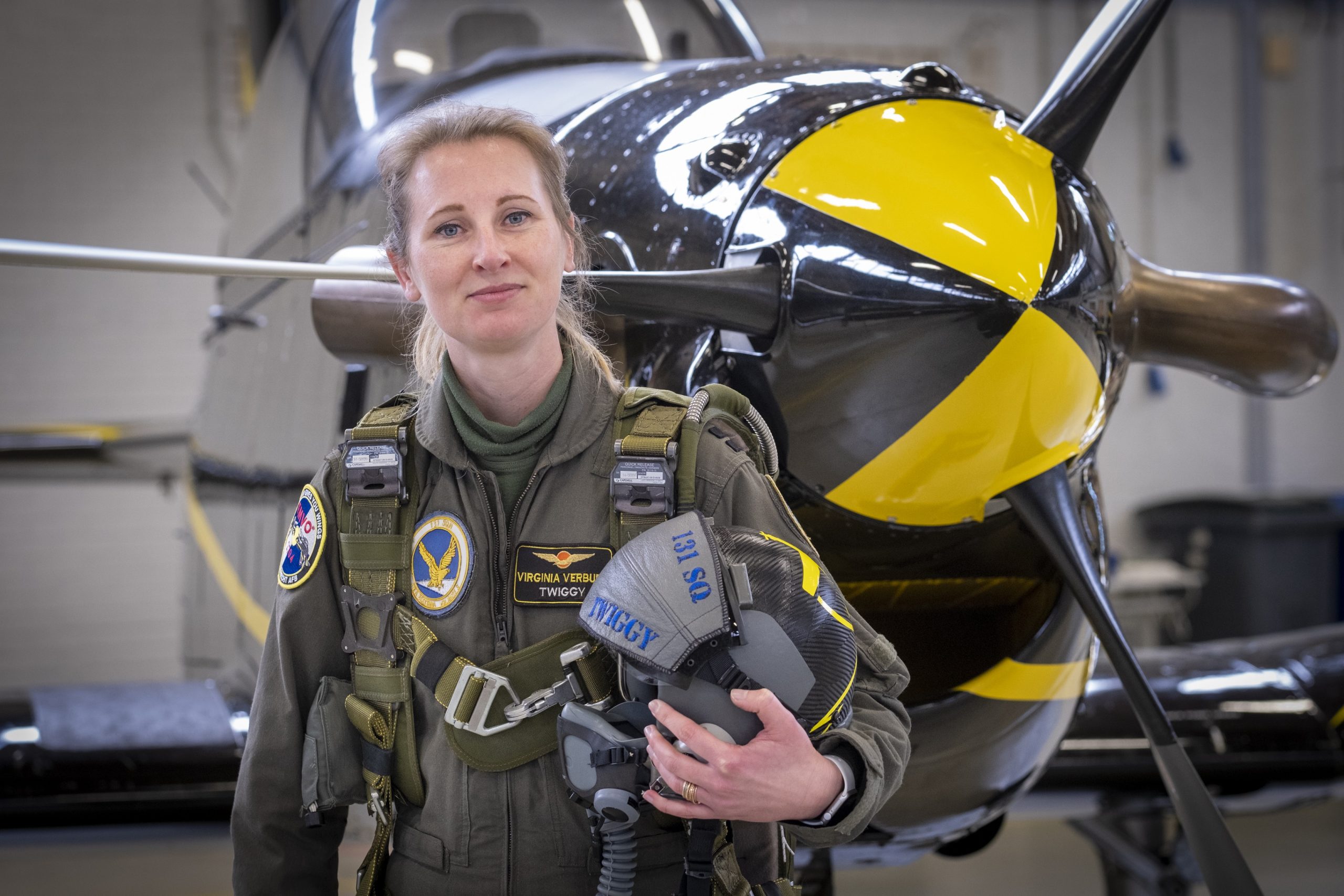 Het is 5 kilometer rijden vanaf de bewaakte ingang, waar een historische T-33-straaljager op een rotonde staat tentoongesteld. Virginia Verburg (34) rijdt langs legeringsgebouwen, een vliegveld en door een stukje bos naar haar werkplek. Daar, aan de rand van vliegbasis Woensdrecht, staan in een grote ruimte dertien glanzend zwarte lesvliegtuigen met felgele strepen waarin Virginia leerlingen leert vliegen. Pilatus PC-7 Turbo Trainers worden die genoemd: dé opstap naar militaire vliegtuigen en helikopters.