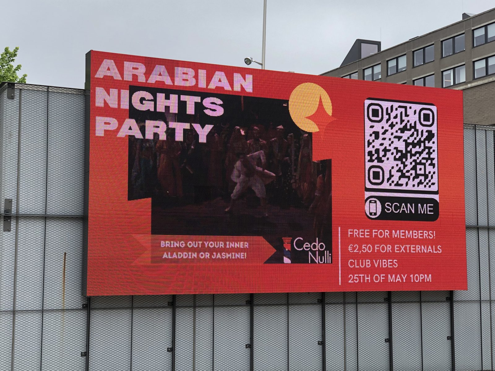 Afgelopen maandag liep ik over de campus en werd mijn aandacht getrokken door het grote billboard. Er werd een evenement van Cedo Nulli aangekondigd dat ‘Arabian Nights Party’ werd genoemd en er was een korte video te zien van de live-action remake van Aladdin uit 2019. Ik had er gemengde gevoelens over en mijn eerste reactie was: “Dit is grappig.” Maar tegelijkertijd voelde het gênant, dus nam ik een foto en deelde die met mijn vrienden. Eerlijk gezegd dacht ik erover om contact met Cedo Nulli op te nemen, maar bij nader inzien zag ik daarvan af omdat ik ze het voordeel van de twijfel geef.