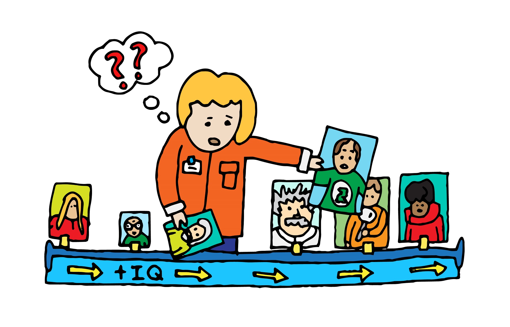 Op de volgende dia van de docent staan precies de foto’s van de genoemde personages. Badura: “En wat hebben ze met elkaar gemeen?” Een student met krullend haar: “Dat ze heel intelligent en hyper gefocust zijn.” Een student naast hem: “En antisociaal.”