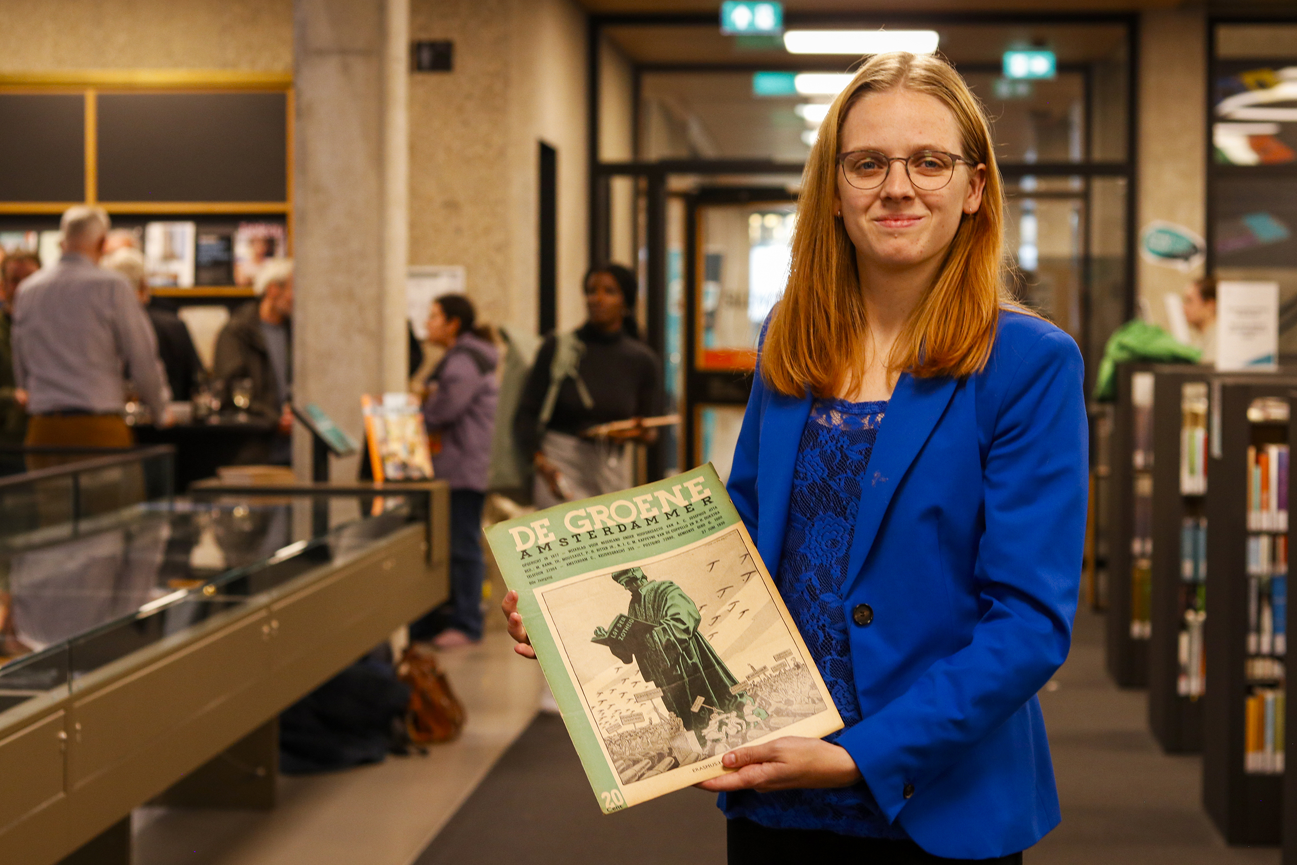 Zo onderzoekt ze hoe Erasmus verweven werd met de stad Rotterdam én met de universiteit. Als voorbeeld geeft ze een editie van De Groene Amsterdammer uit 1936 waar Erasmus op de omslag staat, omringd door mensen die protesteren tegen de toenemende oorlogsdreiging in Europa. “Het is een object uit de tijd dat laat zien hoe Erasmus werd gebruikt om de samenleving te bekritiseren.” Erasmus staat bekend als pacifist, onder andere door zijn essay Klacht van de vrede, waarmee hij in 1517 pleitte voor een vredige samenleving. Op het magazine staat hij zo symbool voor de strijd tegen oorlog.