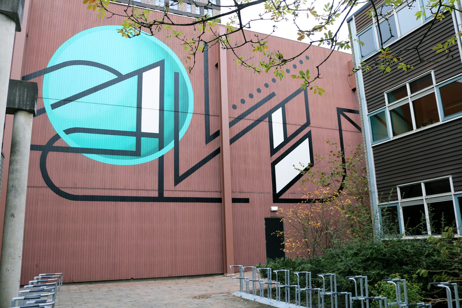 De muur is verfraaid met een grote aqua-turquoise cirkel tegen een diepbruine achtergrond. Over het canvas spreiden zich vanuit het middelpunt zwarte en witte lijnen uit, waardoor een wisselwerking ontstaat van krachtige levendige tinten en kleurrijke contrasten. De moderne esthetiek van de muurschildering zal ongetwijfeld de aandacht van voorbijgangers trekken, voornamelijk studenten die op weg zijn naar hun tentamen.