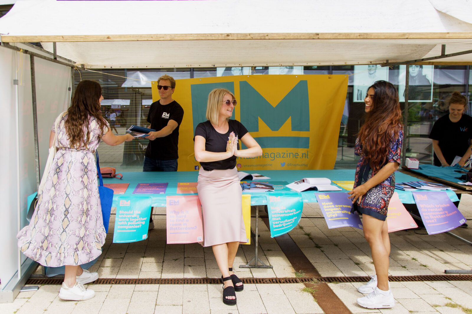 Redactieleden van Erasmus Magazine tijdens de jaarlijkse Eurekaweek-informatiemarkt.