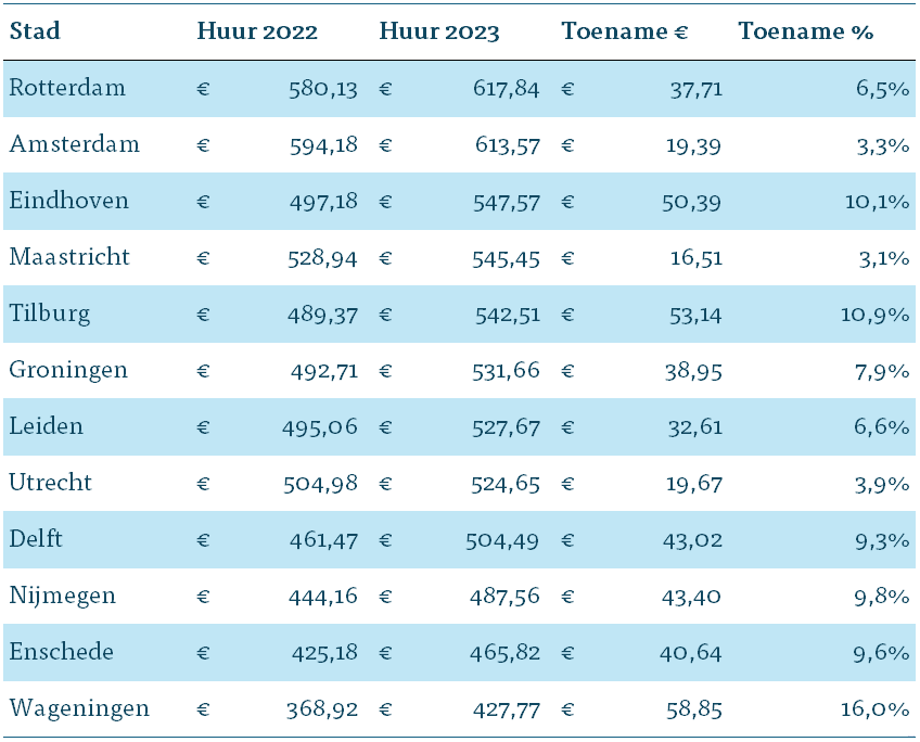 De huren zijn dit jaar weer flink verhoogd. Amsterdam is niet alleen ingehaald door Rotterdam maar ook door Den Haag, waar studenten nu gemiddeld een paar euro meer kwijt zijn: 618 en 614 euro per maand. De goedkoopste universiteitsstad is Wageningen, daar is de huur gemiddeld 428 euro per maand.