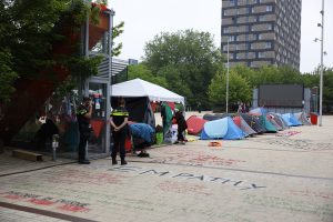 Een schoonmaker is dinsdagochtend begonnen met het weghalen van de leuzen van de ramen van het Foodcourt. Een ander is de Palestijnse vlag op de Institutenlaan aan het wegspuiten. De slangen van de hogedrukspuiten lopen dwars door het tentenkamp, maar de demonstranten maken het de schoonmakers tot nu toe op geen enkele manier lastig.