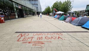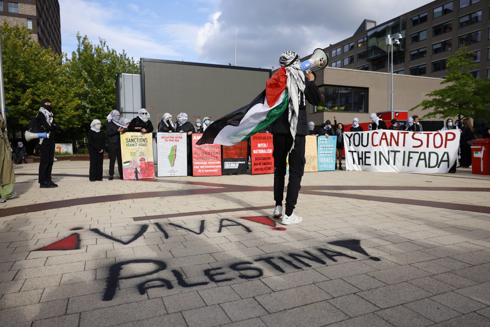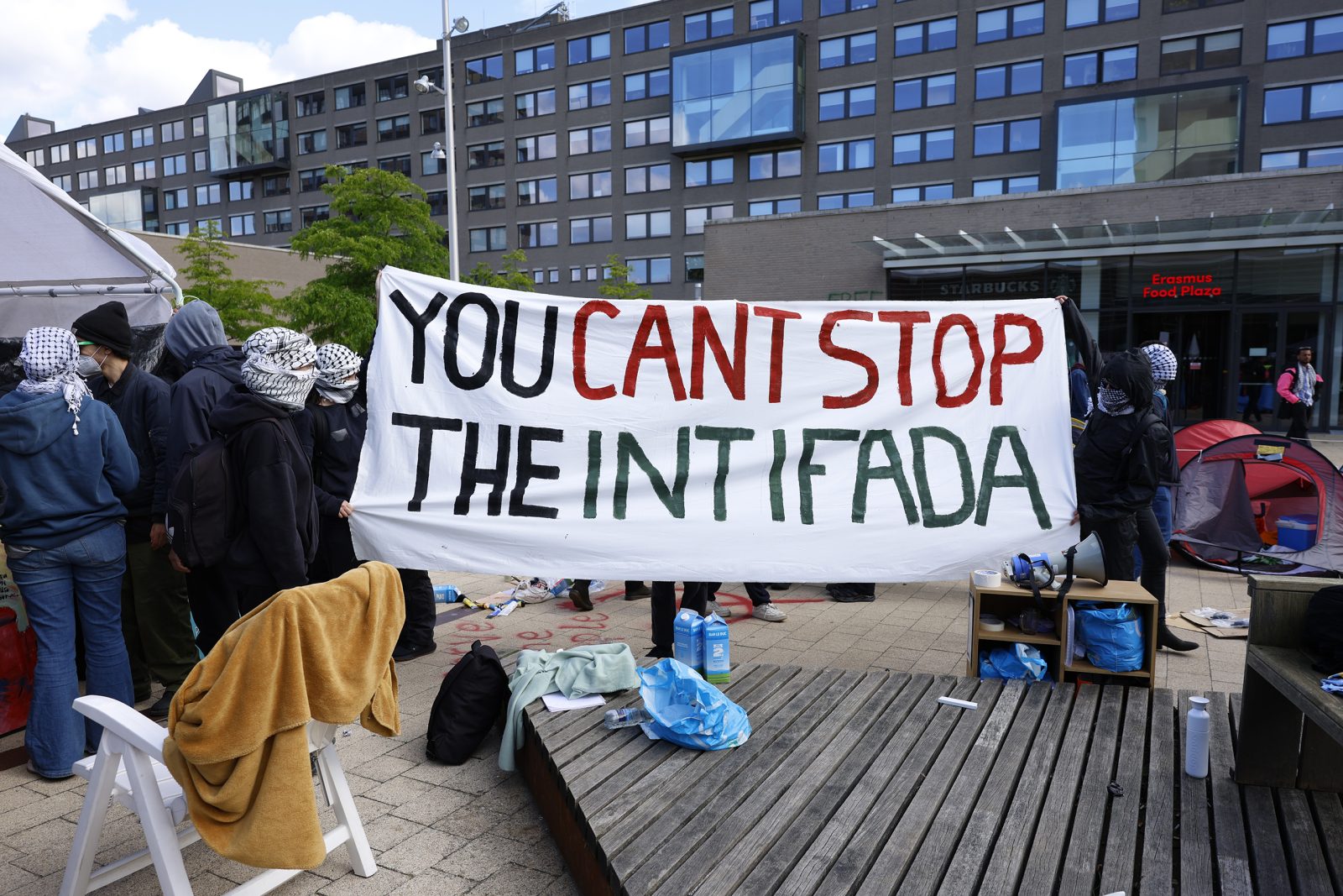 Het pro-Palestinaprotest blijft voorlopig zitten waar het zit op de Erasmus Plaza, ondanks de aanwijzing van de burgemeester en twee verzoeken van agenten om het kampement te verplaatsen. Het ultimatum van Aboutaleb is om 18.00 uur verstreken.