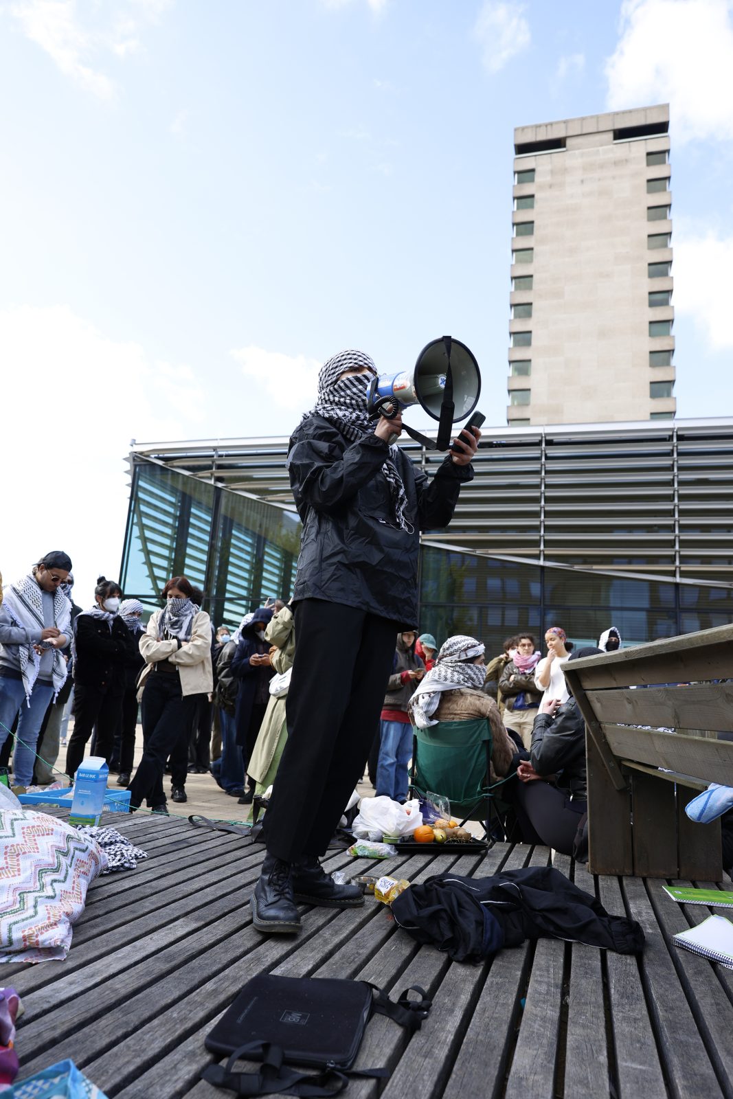 Eerder op de middag was het rustig in het kampement. Ongeveer dertig demonstranten maakten spandoeken, aten wat en overlegden veel met elkaar. Naarmate de deadline van 18.00 uur dichterbij kwam, deden ze sjaals om het hoofd en gaf iemand via een megafoon aanwijzingen en de naam van de advocaat die in geval van arrestatie moet worden gebeld. Met dikke stift werd het telefoonnummer op de arm geschreven.