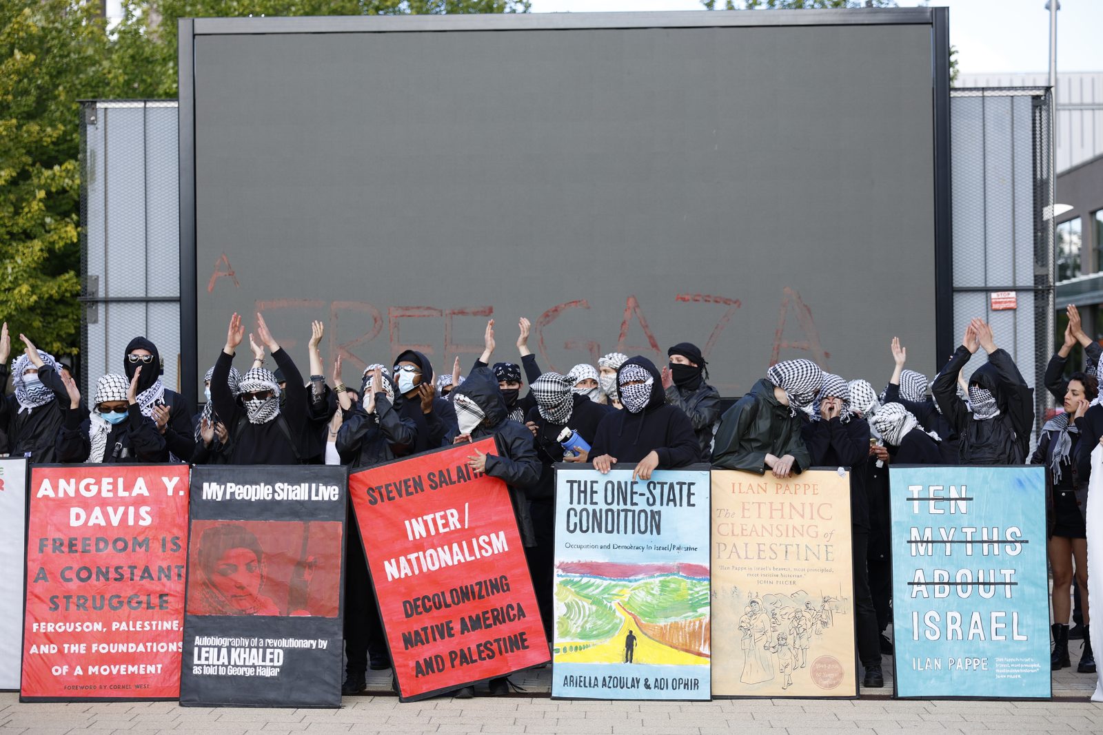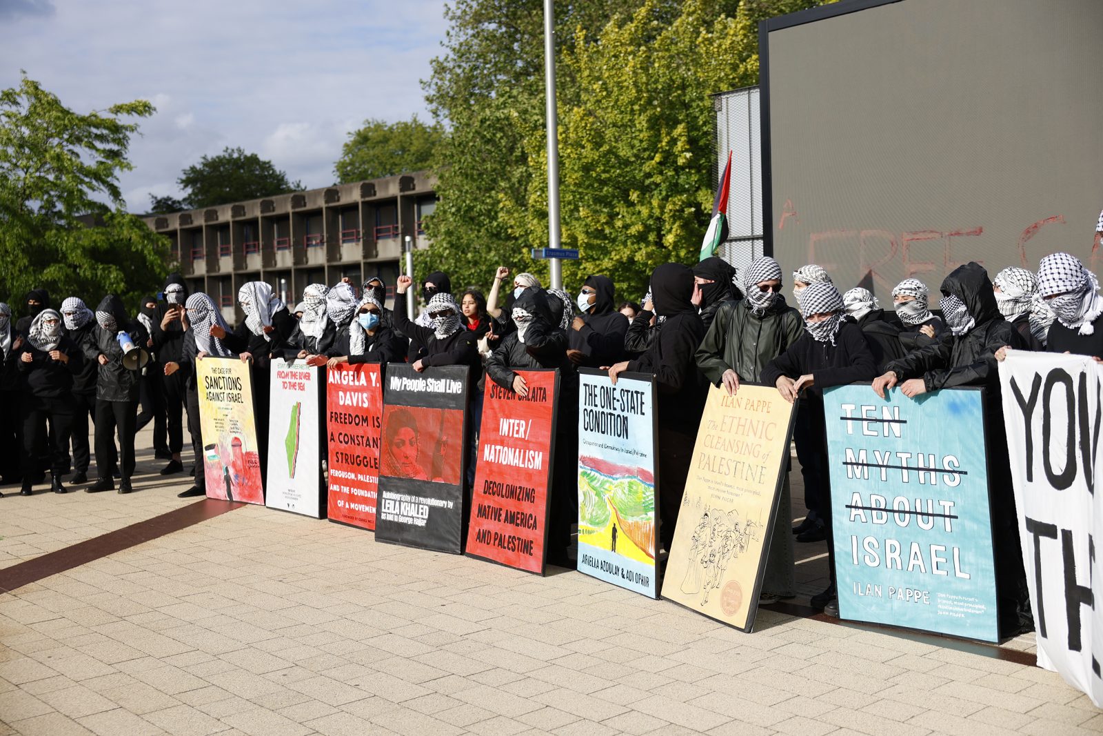 • De demonstranten verschuilden zich achter protestborden voordat ze besloten de campus te verlaten.