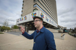 De renovatiewerkzaamheden aan Tinbergen zijn momenteel in volle gang. Het is een gemeentelijk monument en als toezichthouder van Monument Woudestein is Jef van den Putte verantwoordelijk voor de bescherming van alle waardevolle onderdelen in en op het gebouw.