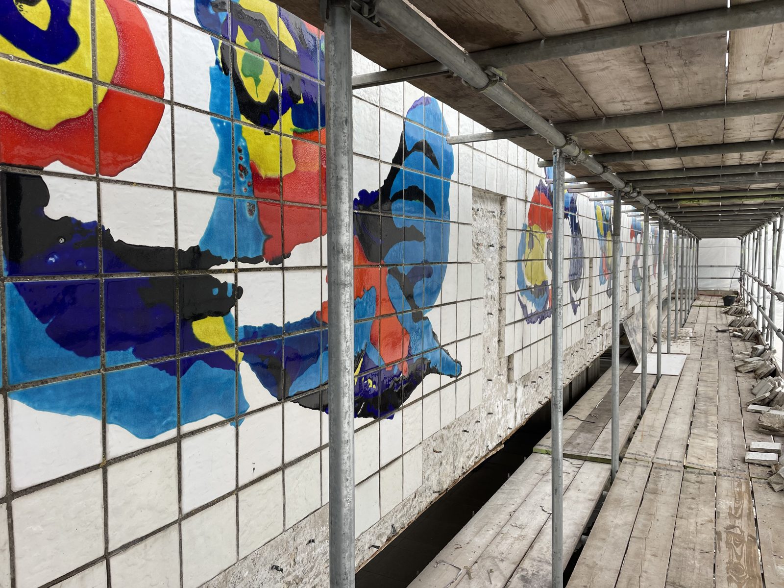 “Er vindt veel sloopwerk plaats, wat het kunstwerk zou kunnen beschadigen”, vertelt Van den Putte. Tijdens een eerdere renovatie werden de tegels afgedekt. Deze keer is besloten om de tegels helemaal te verwijderen voordat de renovatie begon. “We zullen het op een veilige manier doen, om het kunstwerk te beschermen.”