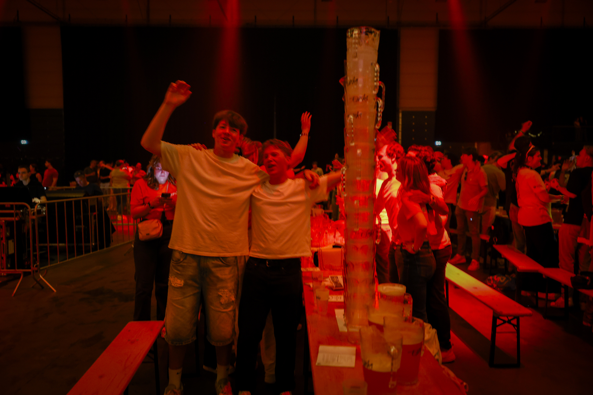 Voor sommige studenten is de muziek te feestelijk om stil te blijven staan. Dansen gebeurt al buiten in de rij. Toen in de regen, nu in een warm Ahoy. Gelukkig staan er ook pitchers met water.