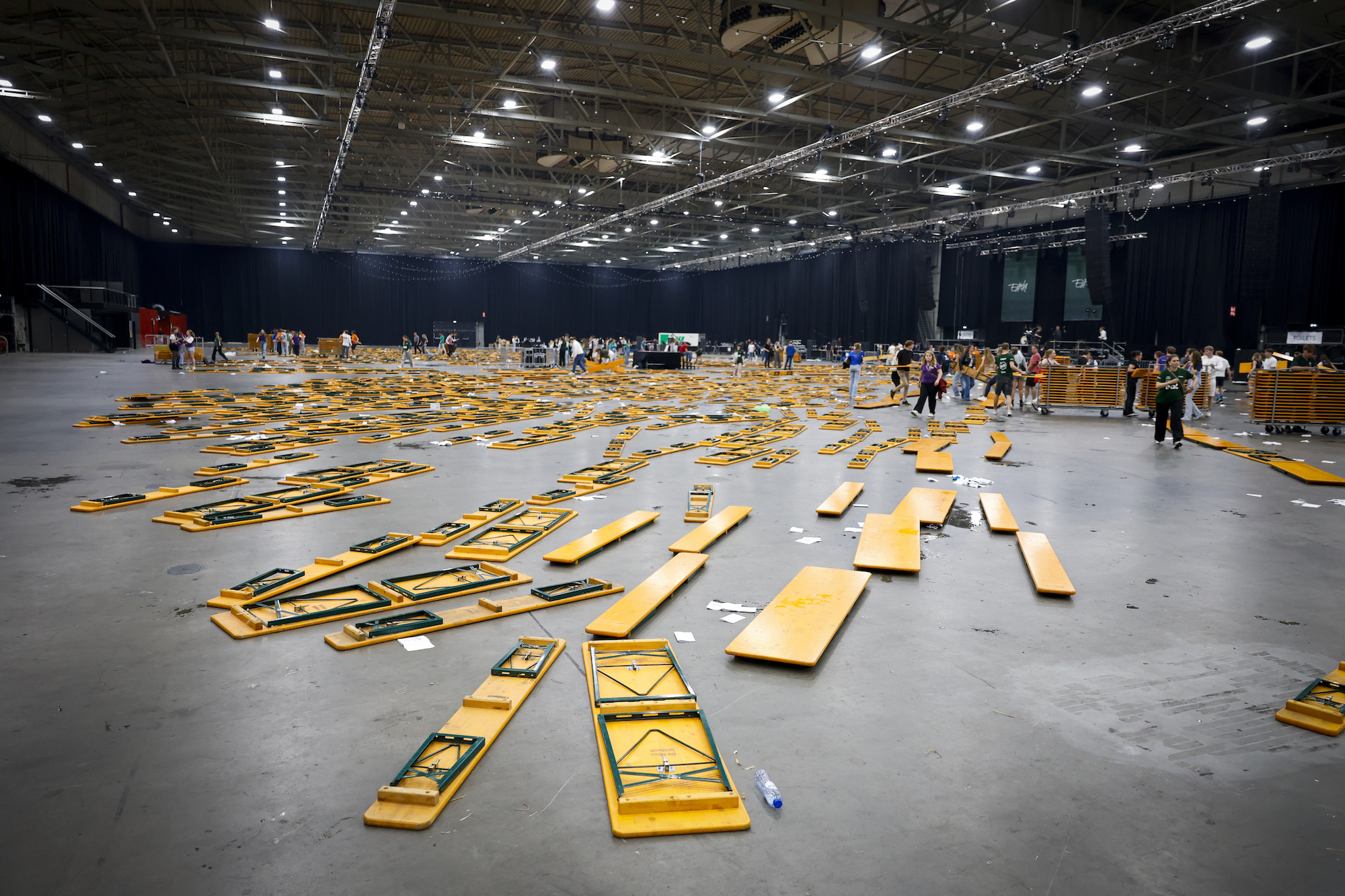Voor de avond voorbij was, moest de Eurekaweekcrew eerst opruimen. De tafels en banken gingen diezelfde avond weer op de stapel. Voor dit jaar is het klaar op de locatie Ahoy, wie weet tot volgend jaar.