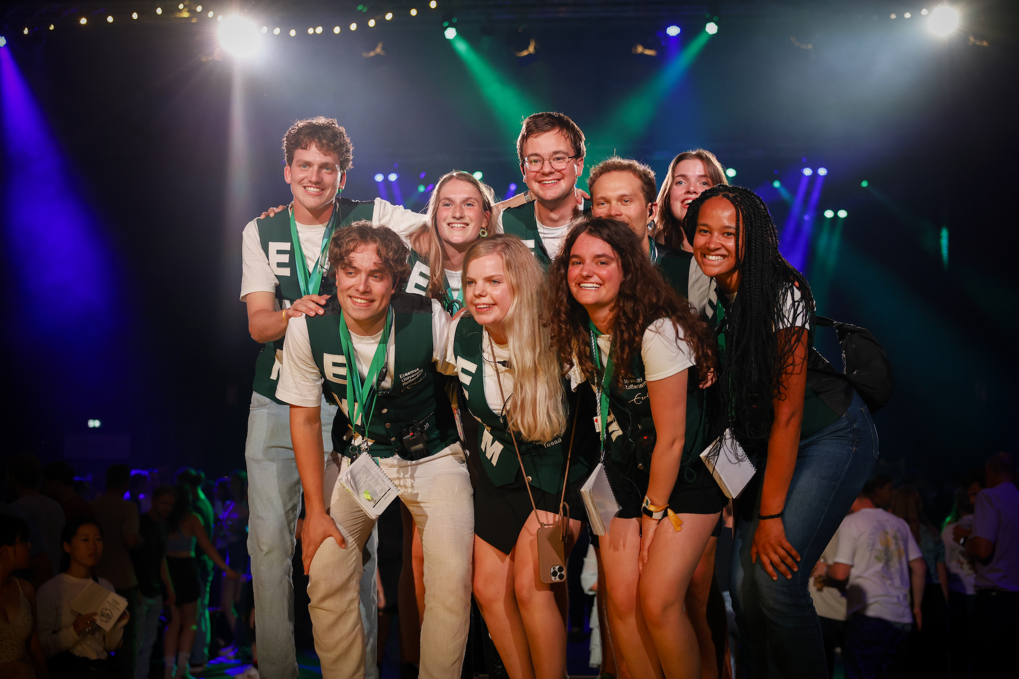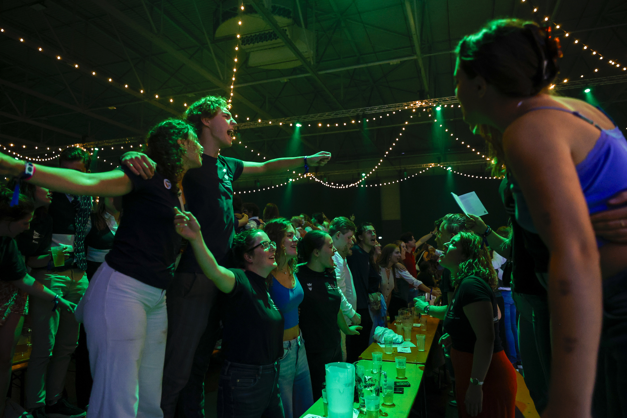 Wie hebben deze week ook alweer op touw gezet? Het management van de week poseert voor een groepsfoto midden tussen de zingende studenten.