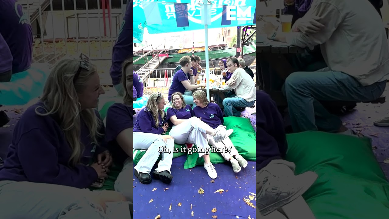 Op het paars versierde terras van studentenvereniging RSG zitten drie studenten op zitzakken te kletsen. “Het is heel gezellig hier”, zegt één van hen. “Lekker knus bij elkaar, dan voel je de kou van de regen niet.” Ze vertellen dat ze uitkijken naar het feest vanavond: “Eerst naar de cantus, daarna naar onze sociëteit voor het optreden van dj Sam Hofman.”