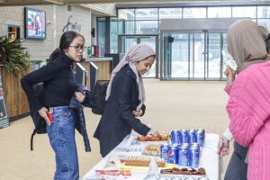 Op de tafel liggen typische gerechten uit het Midden-Oosten zoals msemen (Marokkaanse pannenkoeken) en pistachebaklava, naast meer bekende snacks zoals chips, donuts en energiedrankjes. Ongeveer vijftien studenten hangen er rond, pratend in het Engels en Frans, sommigen rechtstreeks uit de sportschool, met hun sporthanddoeken nog over hun schouders. “Dat we ook Europese studenten zien die onze actie steunen, geeft vertrouwen in de mensheid”, zegt Noor.
