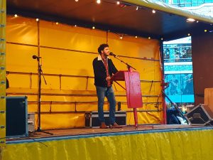 Ook hij beklimt het podium. De plannen van het kabinet noemt hij schandalig. Sommige jongeren stoppen volgens hem met studeren of beginnen er niet eens aan, omdat het allemaal zo duur is. Er zijn vreselijke tekorten op de arbeidsmarkt en toch pest het kabinet studenten weg, sneert hij.