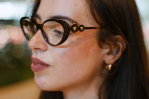 Camila is vaker geïnspireerd door de kunstenaars die ze tegenkomt in haar werk en studie kunstmanagement. Op het moment assisteert ze een flamboyante Griekse galeriehoudster. “Zij heeft een enorme bos krullen die tot aan haar middel valt. Wanneer zij zich echt aankleedt voor de opening van een expositie, is dat wauw, heel bijzonder. Ik ben zelf een stuk minimalistischer.” Camila hoeft niet op te vallen, ze kleedt zich als de witte muren waar kunstwerken op schitteren. Haar extravagantie is haar Versacebril. Die heeft een ronde cat-eye-vorm. De Versacemedusa’s aan de zijkant zitten verstopt onder haar curtain bangs.