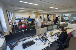Er is een raar soort indeling met kamers voor 4 bureaus en verder in allerlei hoekjes en nisjes een soort open kantoorruimte waar praktisch iedereen gewoon zijn eigen plek heeft. Niets flexibels aan dus. Een beetje het slechtste van beide werelden: geen concentratie en geen flexibiliteit.
