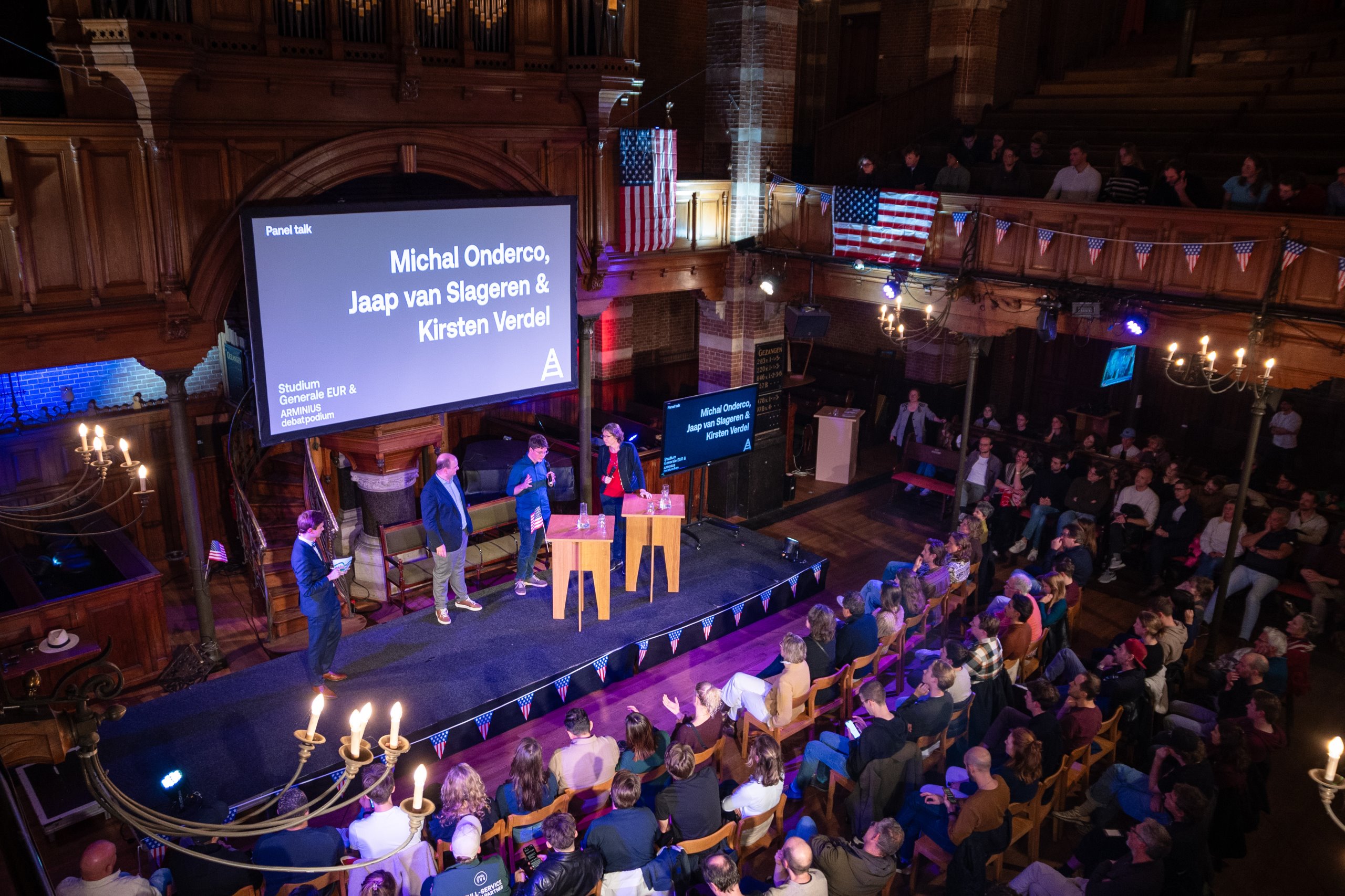 21.00 uur – Mensen stromen de Arminiuskerk binnen en zoeken een plekje in de grote zaal. De zaal is versierd met Amerikaanse vlaggetjes. “Twee weken van tevoren waren alle kaarten al uitverkocht”, vertelt David Boeren van Studium Generale, een van de presentatoren van de avond. Een foodcorner vult de zaal met de geur van gegrilde hamburgers. En tegenover de bar begeven de eerste mensen zich naar de stemdoos van de ‘Arminiusverkiezingen’, waarmee de zaal vanavond gepeild wordt.