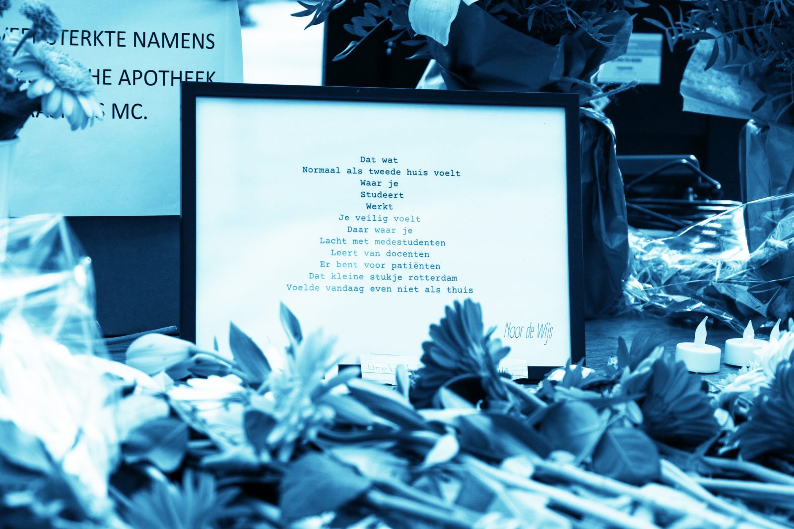 28 september 2023 begon als een gewone dag voor alle collega’s en studenten, beschrijft Stefan Sleijfer, voorzitter van de Raad van Bestuur van het Erasmus MC. “Ze gingen naar werk, college, allemaal met als doel om zieke mensen beter te maken.” De ommekeer kwam met de woorden: “Er is geschoten bij het Gk-gebouw”, beschrijft hij. De gewone dag werd een nachtmerrie van ‘brand, angst en de dood van geliefde collega Jurgen Damen’. Ook Sleijfer beschrijft de docent als iemand die ‘met hart en ziel studenten klaarstoomde voor het vak van arts. “Ik kan het nog niet bevatten.”