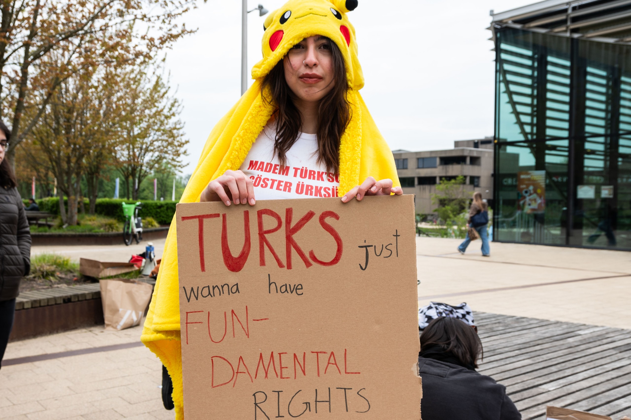 Op deze grijze woensdagmiddag vallen de knalgele Pikachu’s als eerste op. Een student heeft een pikachupet op, een ander een soort cape omgeslagen met  op de capuchon het gezicht van de beroemde Pokémon. Van een leeg ontbijtgranenpak heeft een derde student zelf een masker gemaakt. Het is een verwijzing naar een video van een demonstrant in een pikachupak die de wereld over ging. In de video zie je mensen in het Turkse Antalya vluchten voor de politie. Sindsdien gebruiken jonge demonstranten de Pokémon regelmatig in protesten tegen het Turkse regime, dus ook bij het protest op campus Woudestein.
