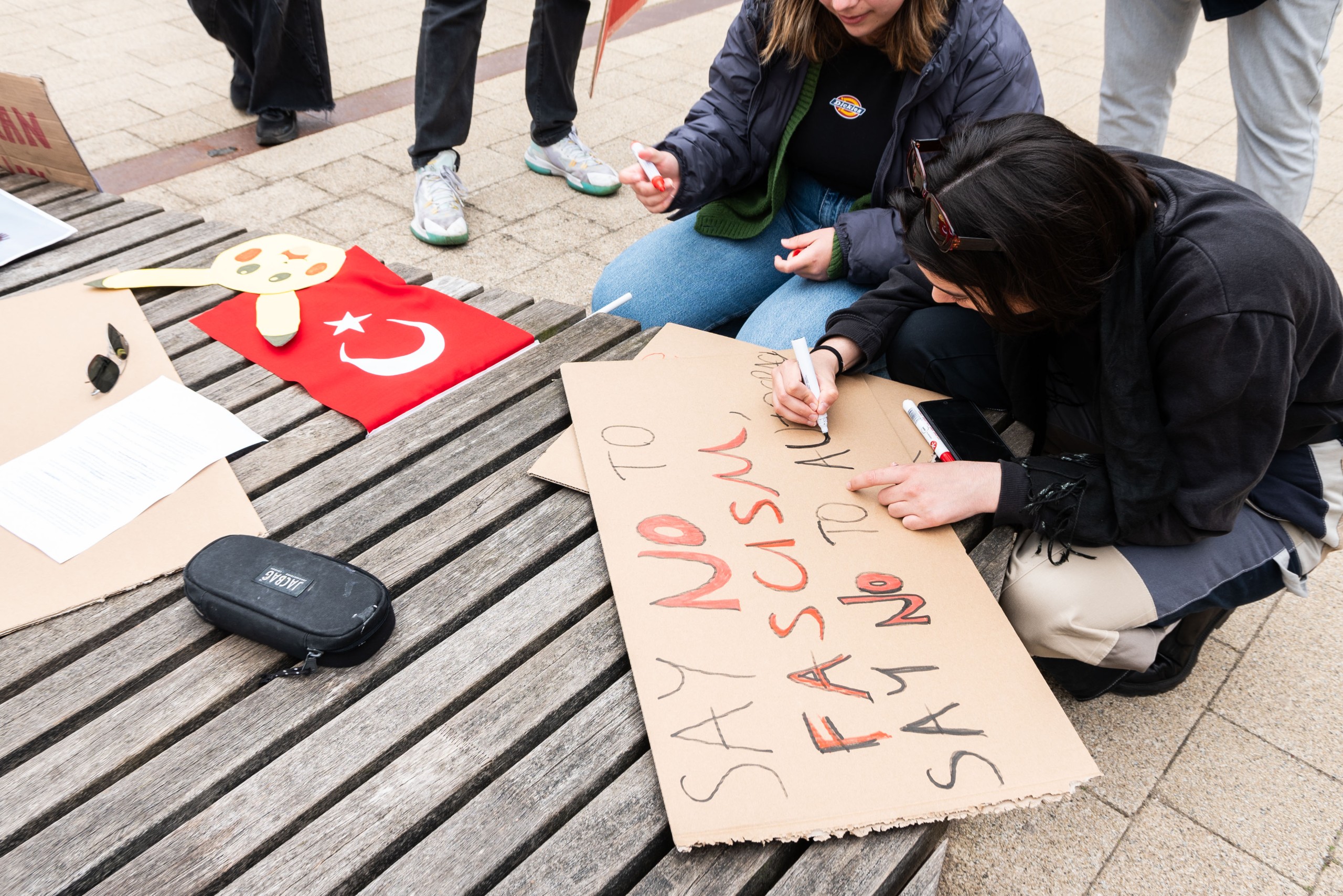 Free speech, free journalists, free students!“, klinkt het woensdagmiddag over het Erasmus Plaza. Ongeveer 35 studenten houden tussen het Paviljoen en het Food Plaza protestborden omhoog. Ze vragen aandacht voor de politieke situatie in Turkije. Directe aanleiding is de arrestatie van de politieke tegenstander van president Erdoğan. “We willen onze bijdrage leveren aan de protesten in Turkije”, vertelt tweedejaars Yaren.