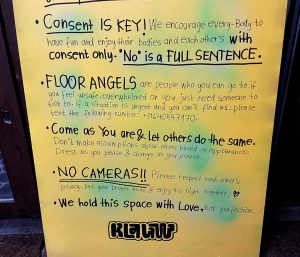Bij binnenkomst herinneren de floor angels iedereen aan de huisregels: geef elkaar de ruimte, let op elkaar, vraag om consent, geen camera’s. De floor angels, herkenbaar aan hun fluorescerende armbanden, zijn vrijwilligers die de veiligheid van de avond in de gaten houden. Ze maken dat hij zich vanavond van een andere kant durft te laten zien. “Hier kan ik mijn vrouwelijke kant meer uiten, zeker als zwart, queer mens.”