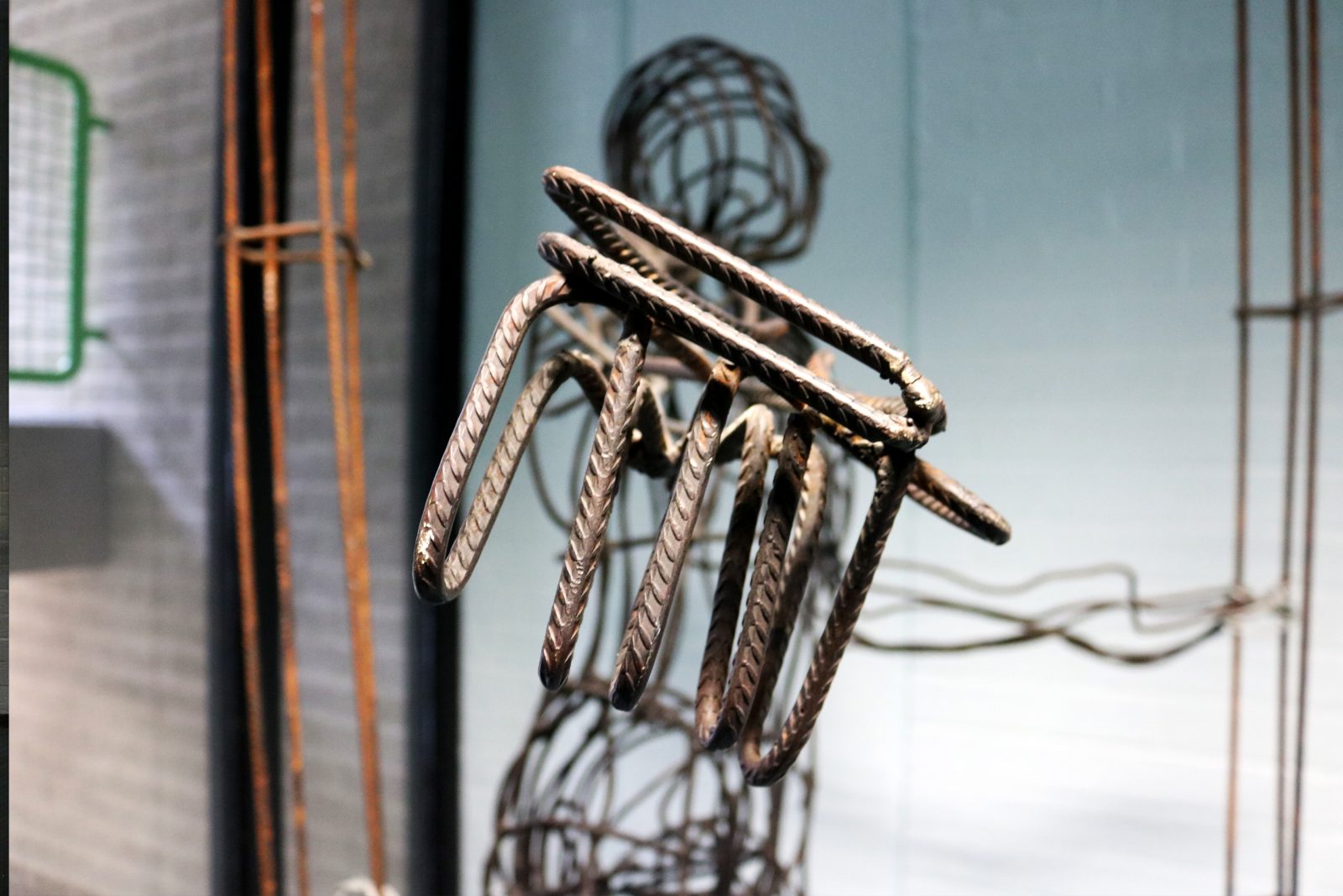 “Het is een mysterie waar het vandaan komt of wie het gemaakt heeft”, zegt Luuk Bode van de kunstafdeling. De sculptuur, een menselijk figuur van stalen draden, is er al minstens zo lang als hijzelf, meer dan tien jaar. Het kunstwerk staat op de tweede verdieping, bij het trappenhuis verderop in de gang. “We hebben geprobeerd het te googelen, maar er zijn best veel kunstwerken met stalen draden”, legt Bode uit. Het werk heeft geen herkenbare handtekening en Bode kon nergens een kunstenaar vinden die bij deze stijl past.