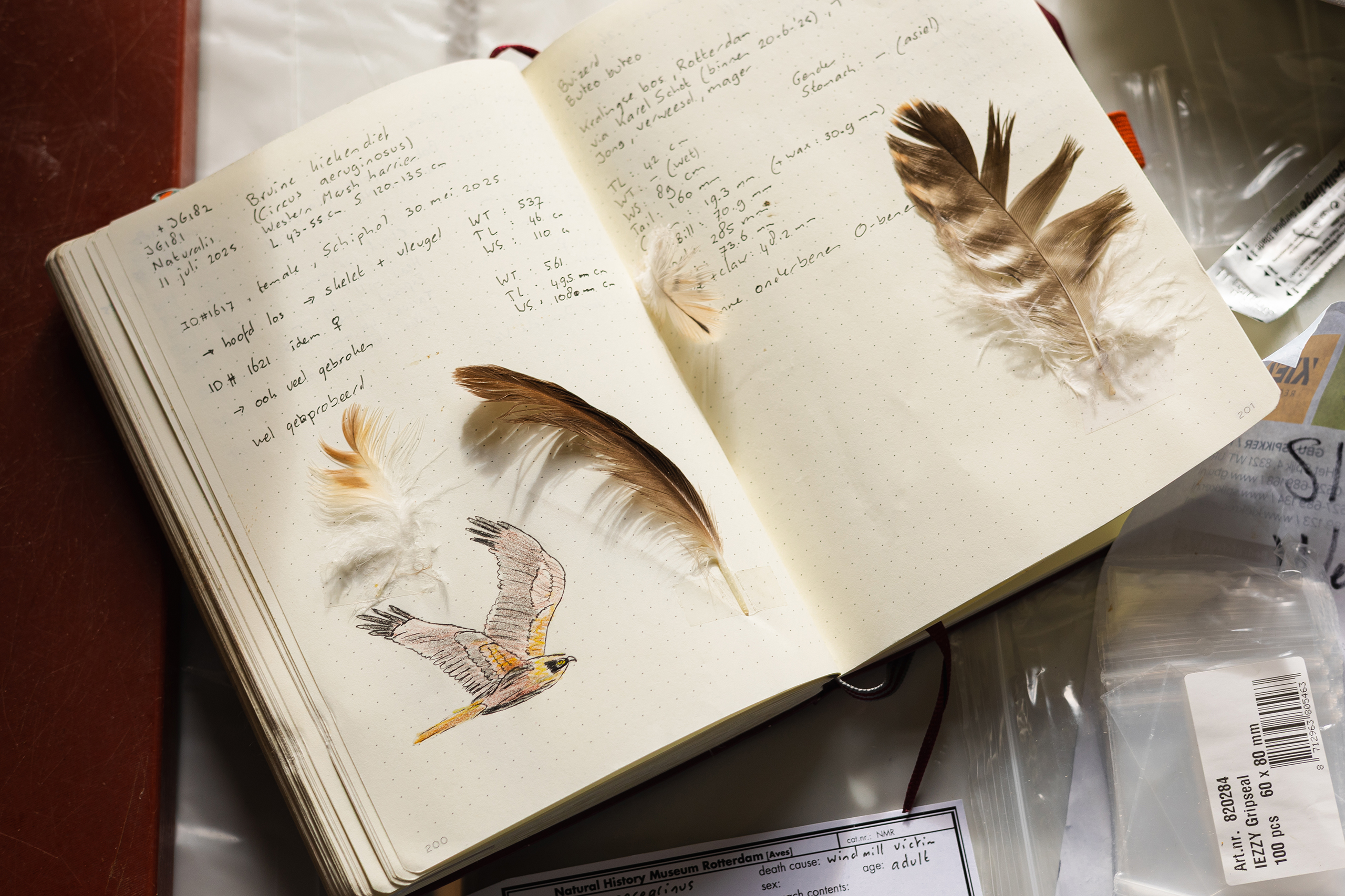 ‘Heb vertrouwen’, schreef Van der Geest op 9 augustus 2022 met kapitalen in zijn notitieboek. Daarin maakt hij vanaf zijn eerste dag aantekeningen. Welke vogel had hij in handen, hoe is het dier gestorven, welke tips kreeg hij. “De tip over vertrouwen is nog steeds een van de beste. Tijdens het preparatieproces ziet de vogel er niet uit, maar na een wasbeurt en het vullen is het weer prachtig.” De tip kreeg hij van zijn inmiddels gepensioneerde Erasmus MC-collega Erwin Kompanje. “Ik had al wel eens gehoord van vogels prepareren, en meegekeken bij Naturalis – ik woon in Leiden. Toen Erwin een speldje kreeg voor veertig jaar vrijwilligerswerk als preparateur bij het museum raakten we aan de praat en nodigde hij mij uit om mee te gaan. Ik ben nooit meer weggegaan.”
