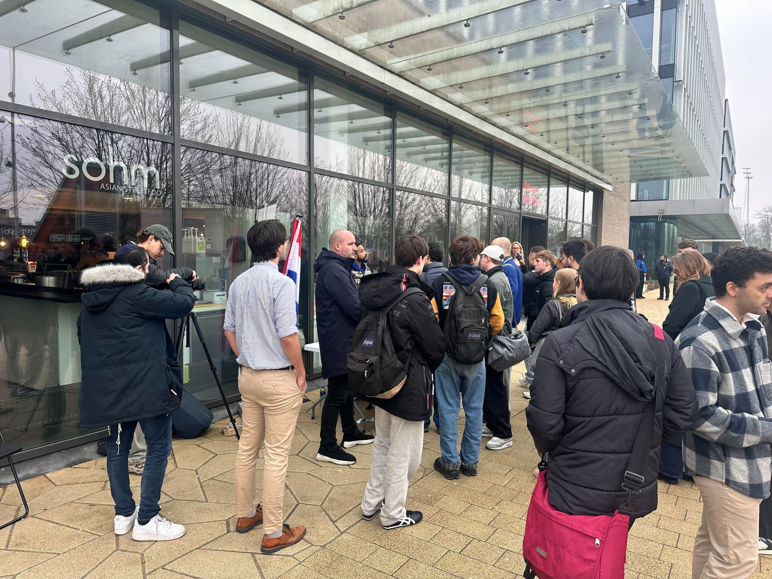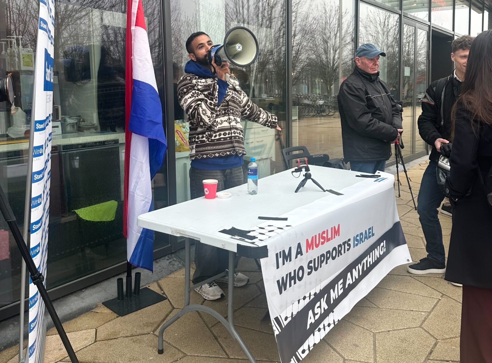 Pal voor de Sohmi zit de pro-Israëlische activist Luai Ahmed achter een tafeltje. Links en rechts staan camera’s die elke interactie vastleggen voor zijn socialmedia-accounts en naast Ahmed zet een vertegenwoordiger van de pro-Israëlische organisatie StandWithUs nog een stoeltje neer, voor mensen die het gesprek met hem aan willen gaan. Naast de tafel wordt de Nederlandse vlag gehesen en aan de tafel wordt een spandoek geducttapet. “Ik ben een moslim die Israël steunt”, staat erop. “Ask me anything!”