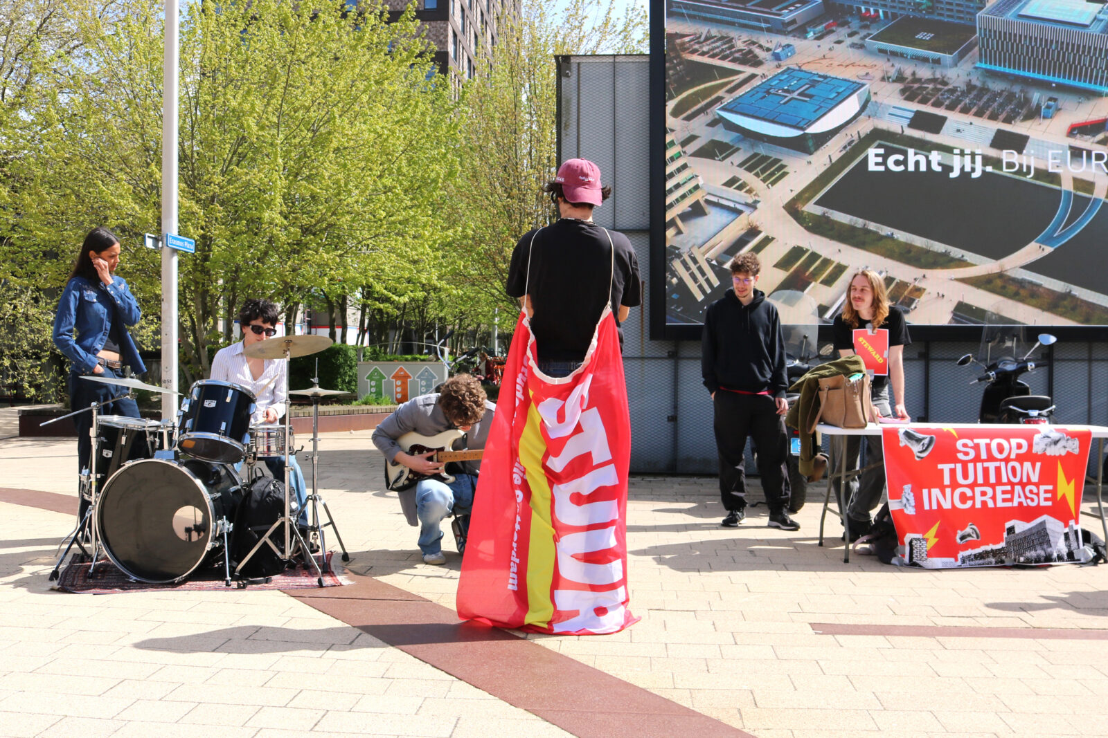 Een felrood spandoek met de tekst ‘Stop de collegegeldverhoging’, een drumstel, een gitaar en flyers: rond 13 uur verzamelde een klein groepje studenten zich bij het Food Plaza. Aan het begin van het protest werkte de gitaar nog niet. Later klonk die alsnog mee met het luide gedrum. De groep mocht geen flyers uitdelen – dit stond niet in het demonstratieverzoek.