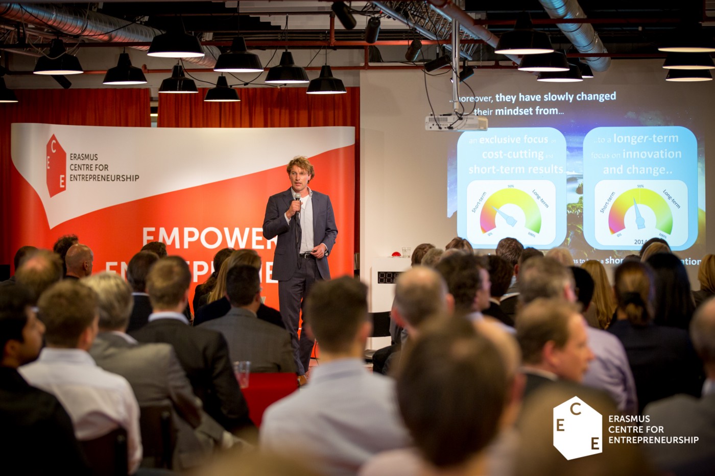 Justin Jansen, wetenschappelijk directeur van het ECE en hoogleraar Ondernemerschap bij RSM, aan het woord tijdens het ECE Congres 2014. Foto met toestemming van het ECE.