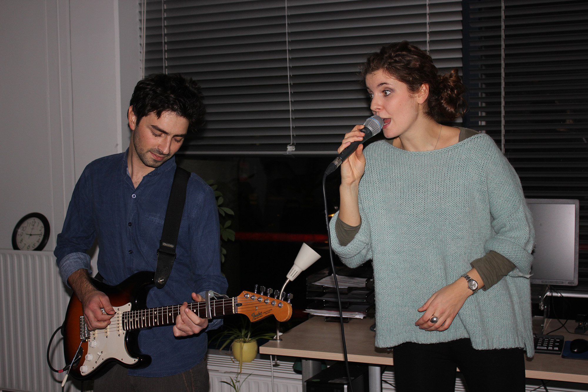 An act, which was situated on the other end of the building, enabling many to grab a beer before heading for the evening’s final performance in room E1-13. Anna Bernard and Frederico Castelli were already waiting. They played a host of cover songs ranging from The Beatles’ Across the Universe to lesser known artists from London and around the world. While Frederico was playing his guitar and refusing to unbutton his shirt during the more romantic songs, Anna tried her best on the vocals. The two of them even made it to a bonus song before having to end their set and this rather unusually located evening.