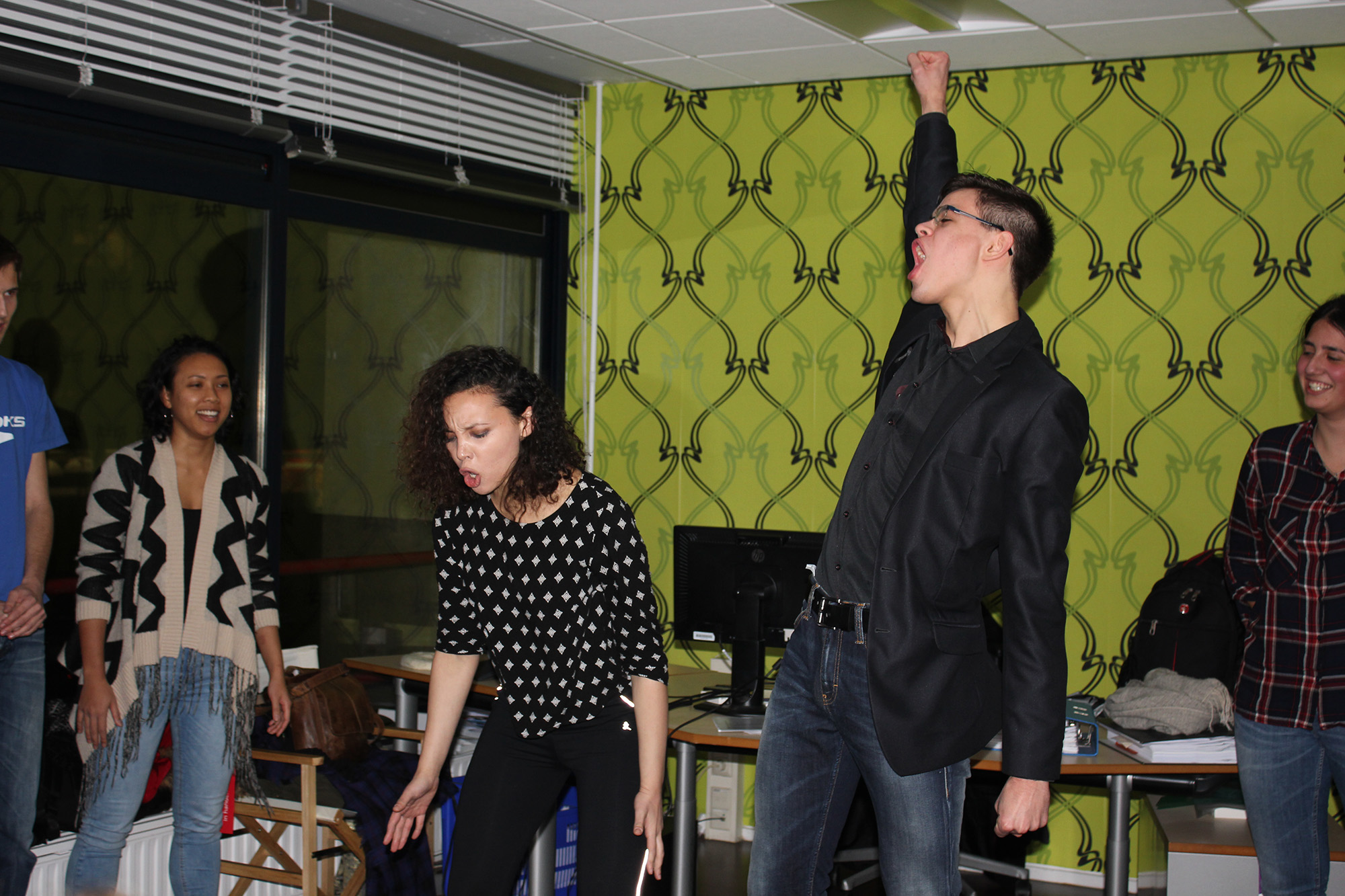 The space issue became clear upon entering room E1-23, occupied by the theatre group Wild(E). The room was split in half between audience and performers, which did not hinder the latter ones to deliver a turbulent improvisation. Their first act, called Switch, consisted of the actors taking turns in a two person performance, often resulting in unexpected outcomes. Wild(E) then went into a different direction, letting the audience choose three actors under the supervision of actor appointed director Roman Weber (Wild(E) chairman and 2nd year IBCoM). After this experience of love, birth, life and death set in an imaginary HAS Kebab, it was time to applaud and head back to the lobby for the second round.