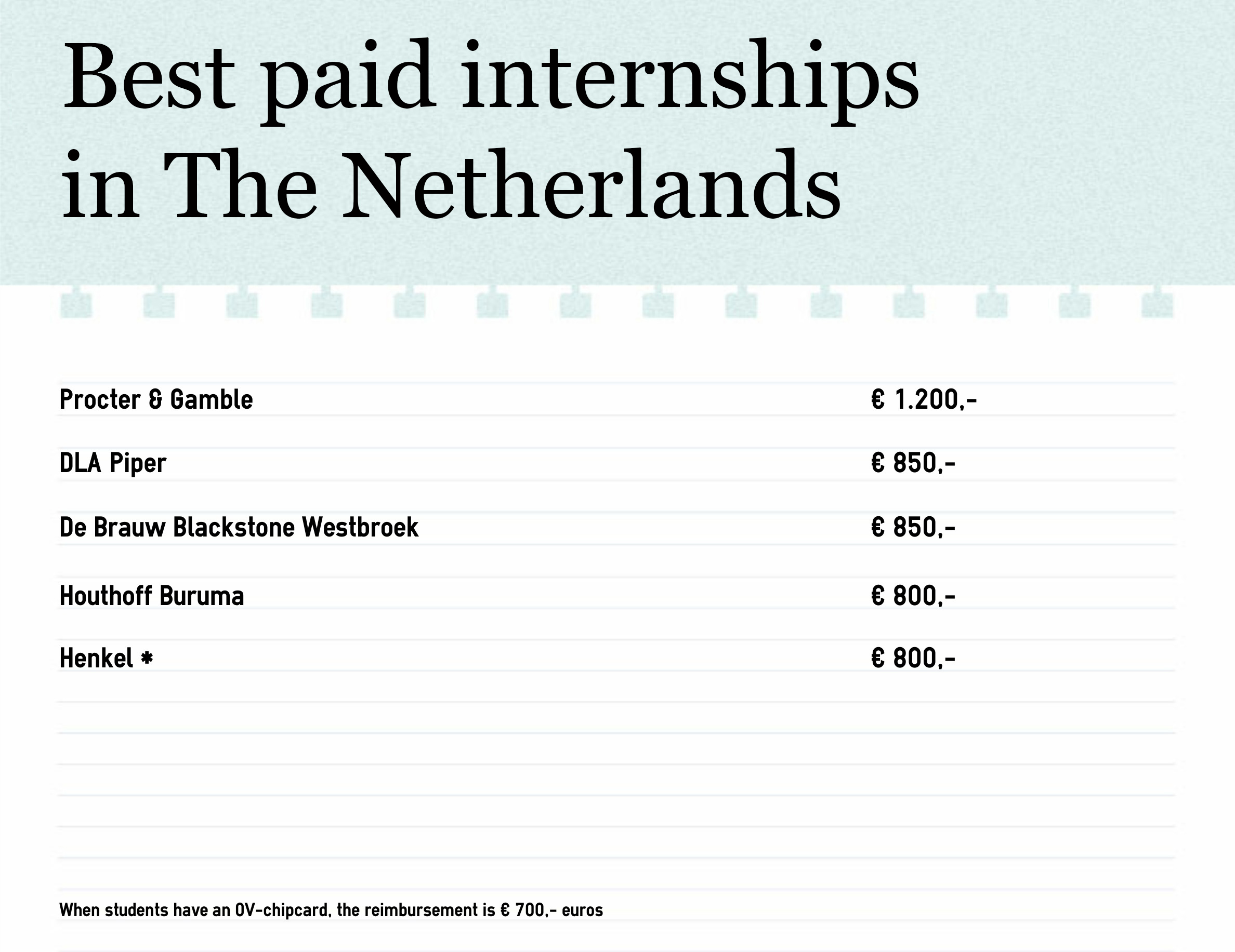 The best chance getting a well paid internship are internships at law firms, is the conclusion of Dutch newspaper NRC based on numbers provided by Magnet.me. Three out of five companies in the top 5 internships with high reimbursements are law firms. Yet, none of these three are spending the most money on their interns. That place is held by Procter & Gamble, who pay their interns 1200 euros a month.