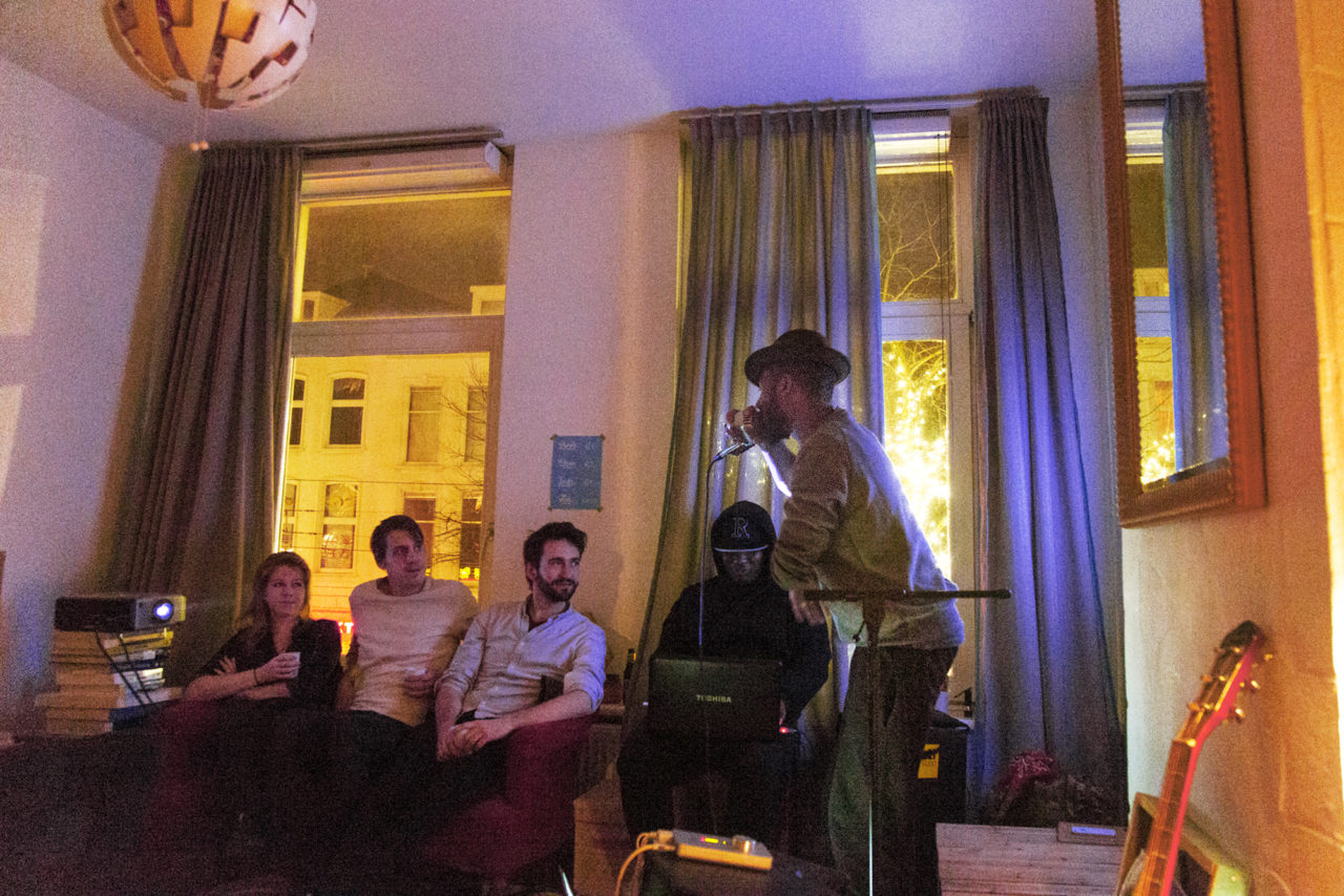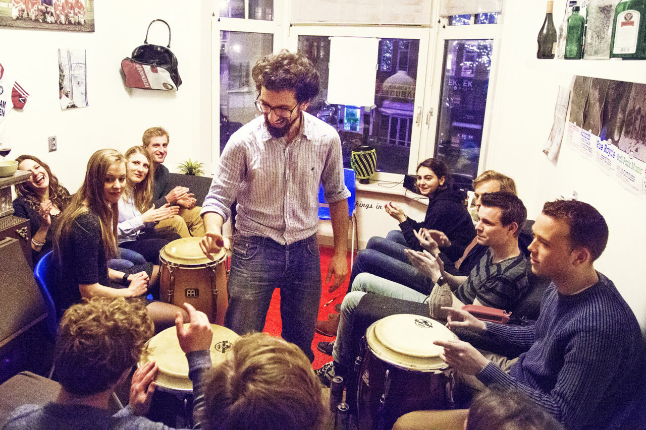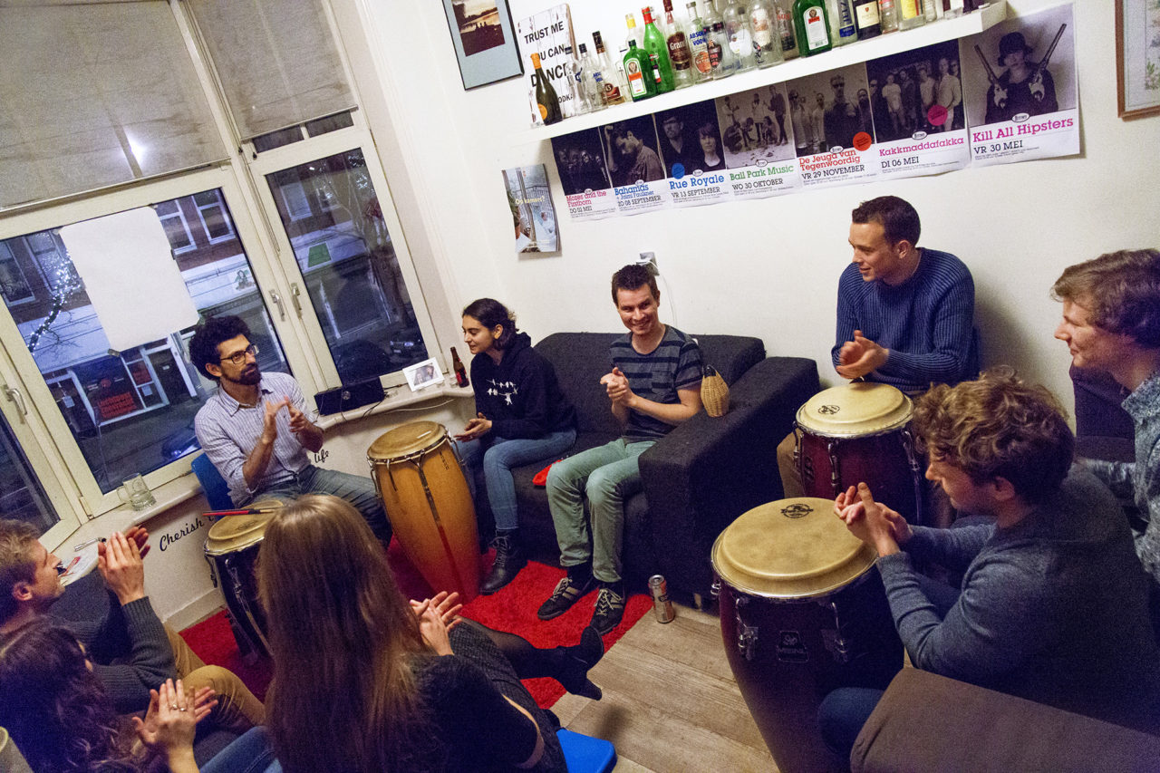 Upon arrival, the German percussionist Ulas Aksunger starts assigning the audience members roles in his impromptu orchestra. Like a regular conductor, Ulas directs his musicians, with his baton doubling as a drum stick. While the guests and housemates drum and clap, host Sjoerd dances in the corner of his room, without a care in the world. “Not necessarily because the music’s that good, but because it’s a great feeling.”