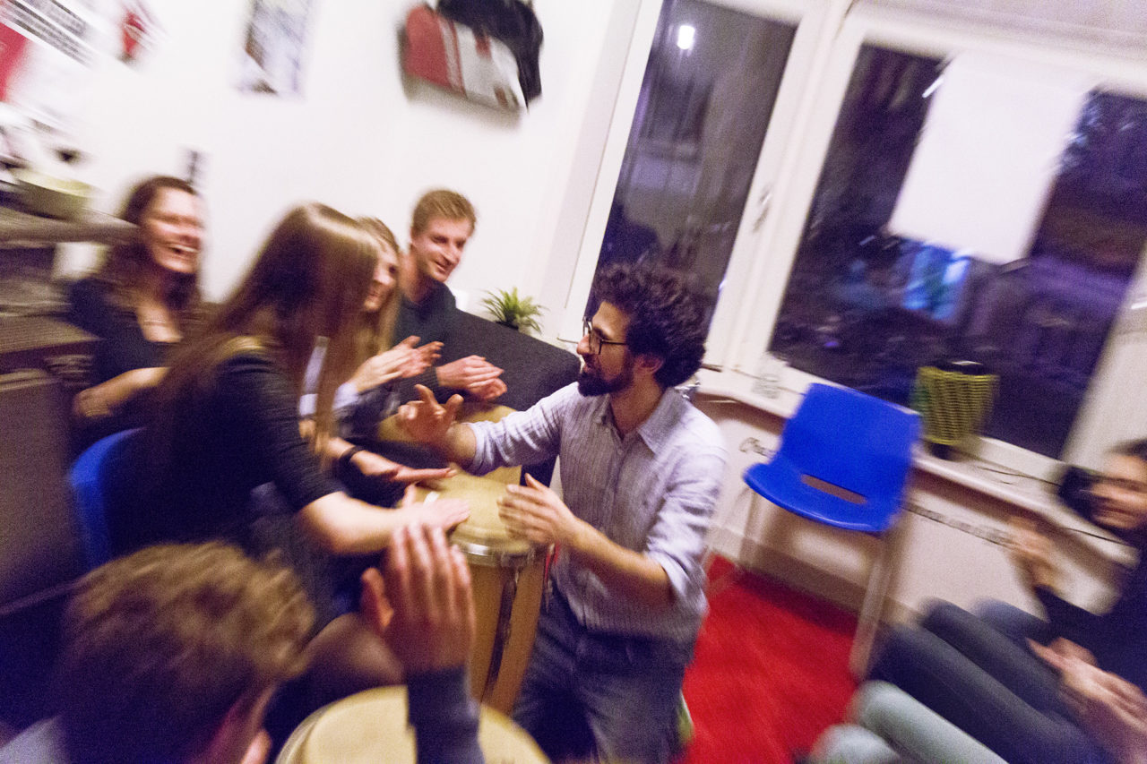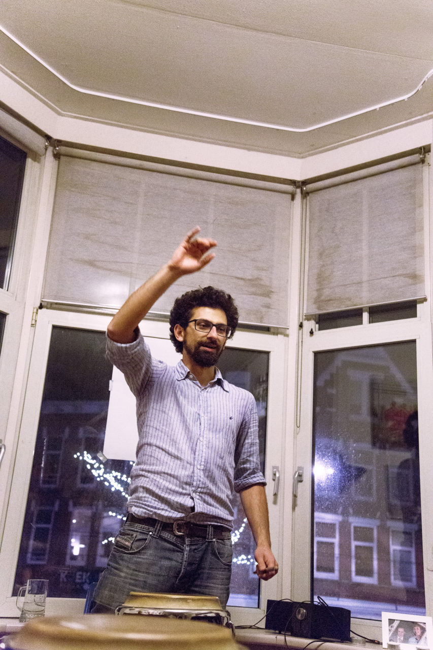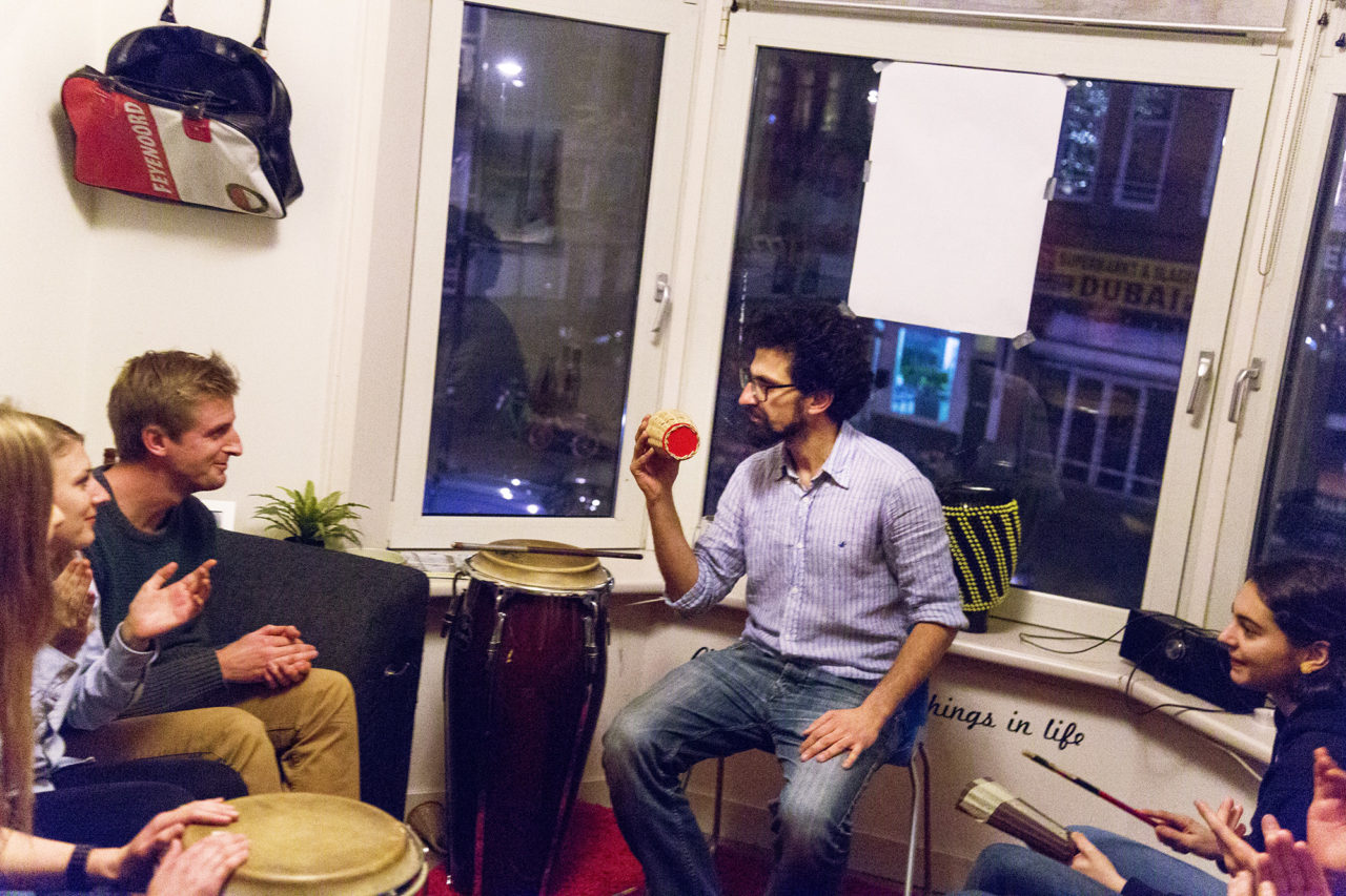 Upon arrival, the German percussionist Ulas Aksunger starts assigning the audience members roles in his impromptu orchestra. Like a regular conductor, Ulas directs his musicians, with his baton doubling as a drum stick. While the guests and housemates drum and clap, host Sjoerd dances in the corner of his room, without a care in the world. “Not necessarily because the music’s that good, but because it’s a great feeling.”