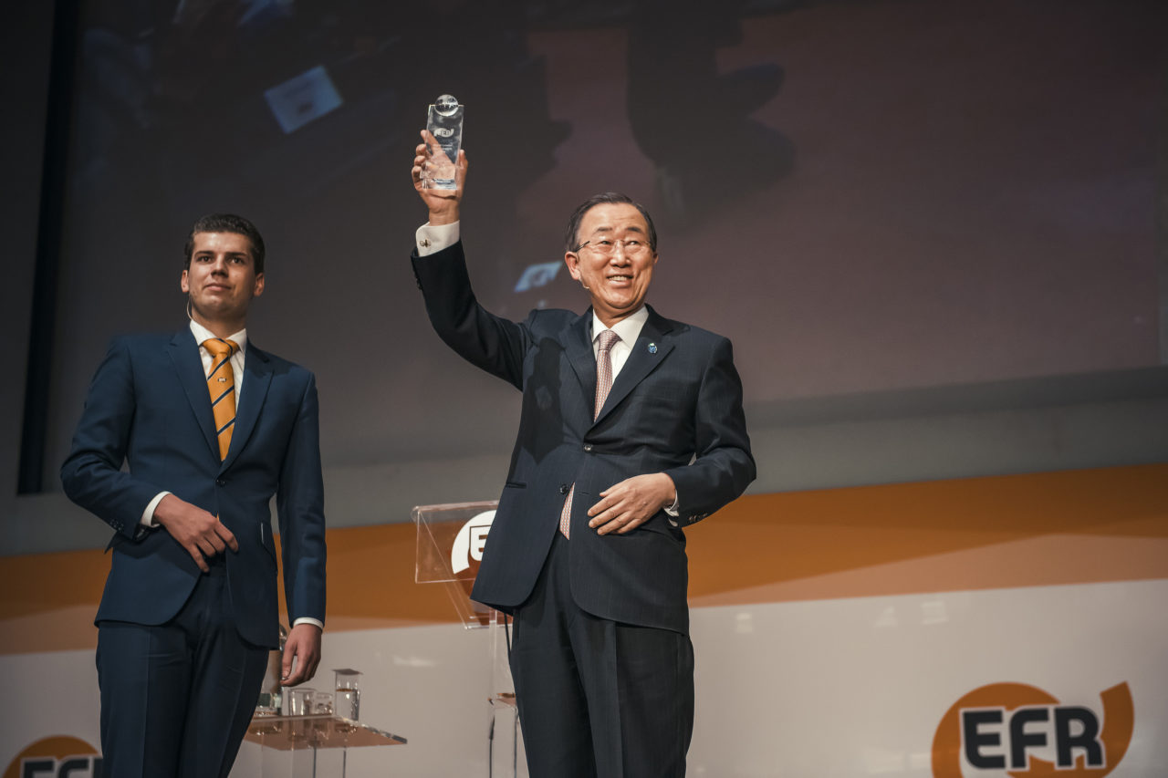 The public welcomed Ban, the highest ranking functionary of the United Nations, with a standing ovation when he entered the aula. Following speeches by EFR President Rik Bross and Vice-President Annegeke Jansen, it was Ban’s turn to speak. He gave a lengthy speech in which one of the key themes was a call for sustainability. “We live as if there were more worlds to live on, but there is really only one Earth.”