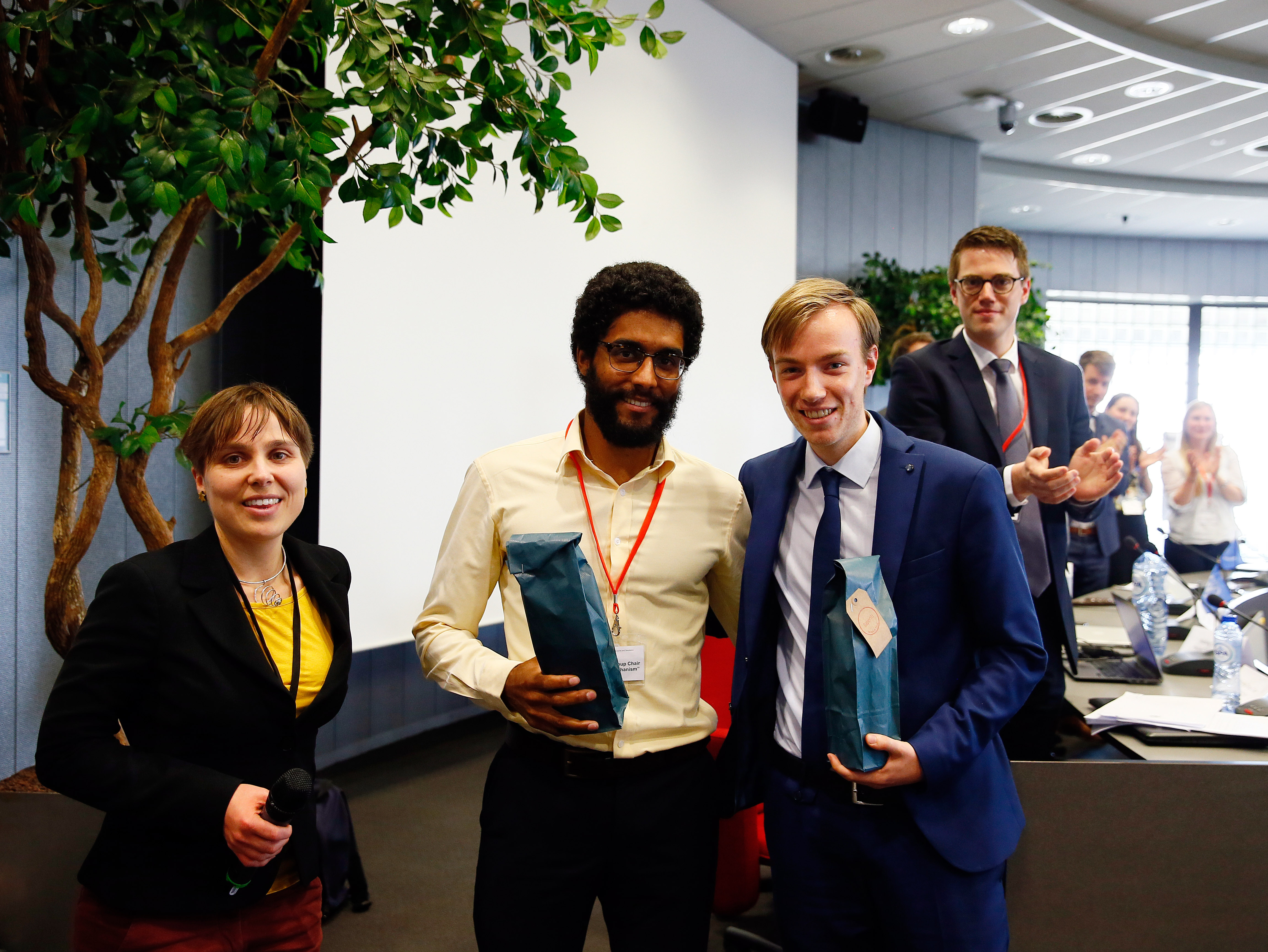Yann Liasse (centre left) and Matthijs van Huijgevoort (centre right) pose with their award for best negotiators of this year’s event.