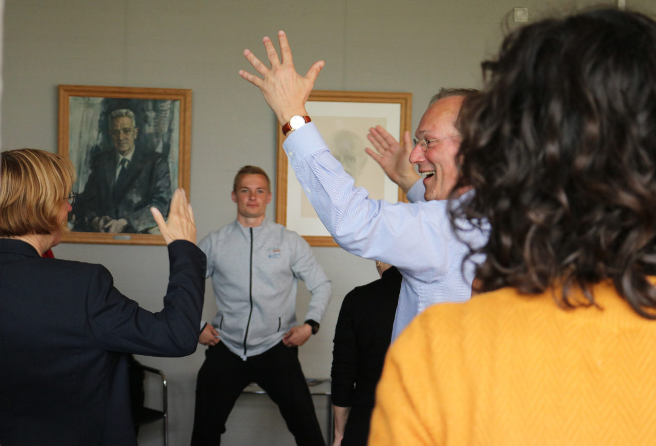It soon transpired that this form of training was not entirely free from danger when board member Bart Straatman, a very enthusiastic participant, accidentally knocked off a colleague’s glasses, thankfully without serious consequences. For her part, Chairwoman of the Board Kristel Baele had no difficulty performing the exercises. “I’m already getting a fair amount of exercise. Mainly yoga, and I’ll go for the odd walk.”
