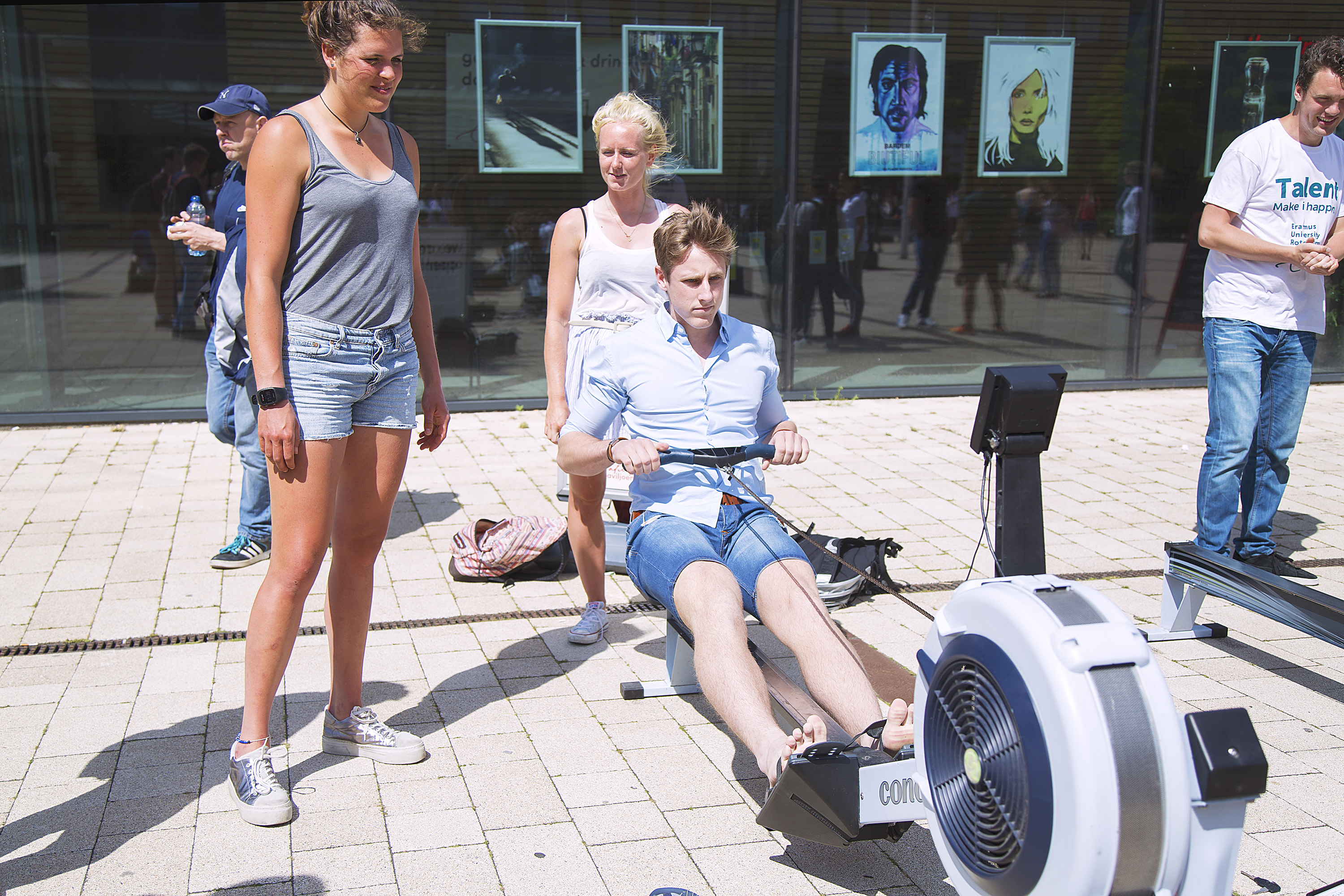 Two rowing machines had been installed near the Erasmus Pavilion. It was serious business here. Extremely fanatical participants, some dressed in sports gear, were working their arses off to complete the exercise in the fastest time possible, driven by adrenalin-pumping music. Kevin van der Kaaij, a 21-year-old Fiscal Economics student, sought to live up to his reputation. “During Eureka Week, I logged the fastest time in the rowing exercise. I’m trying to achieve the same thing here.”