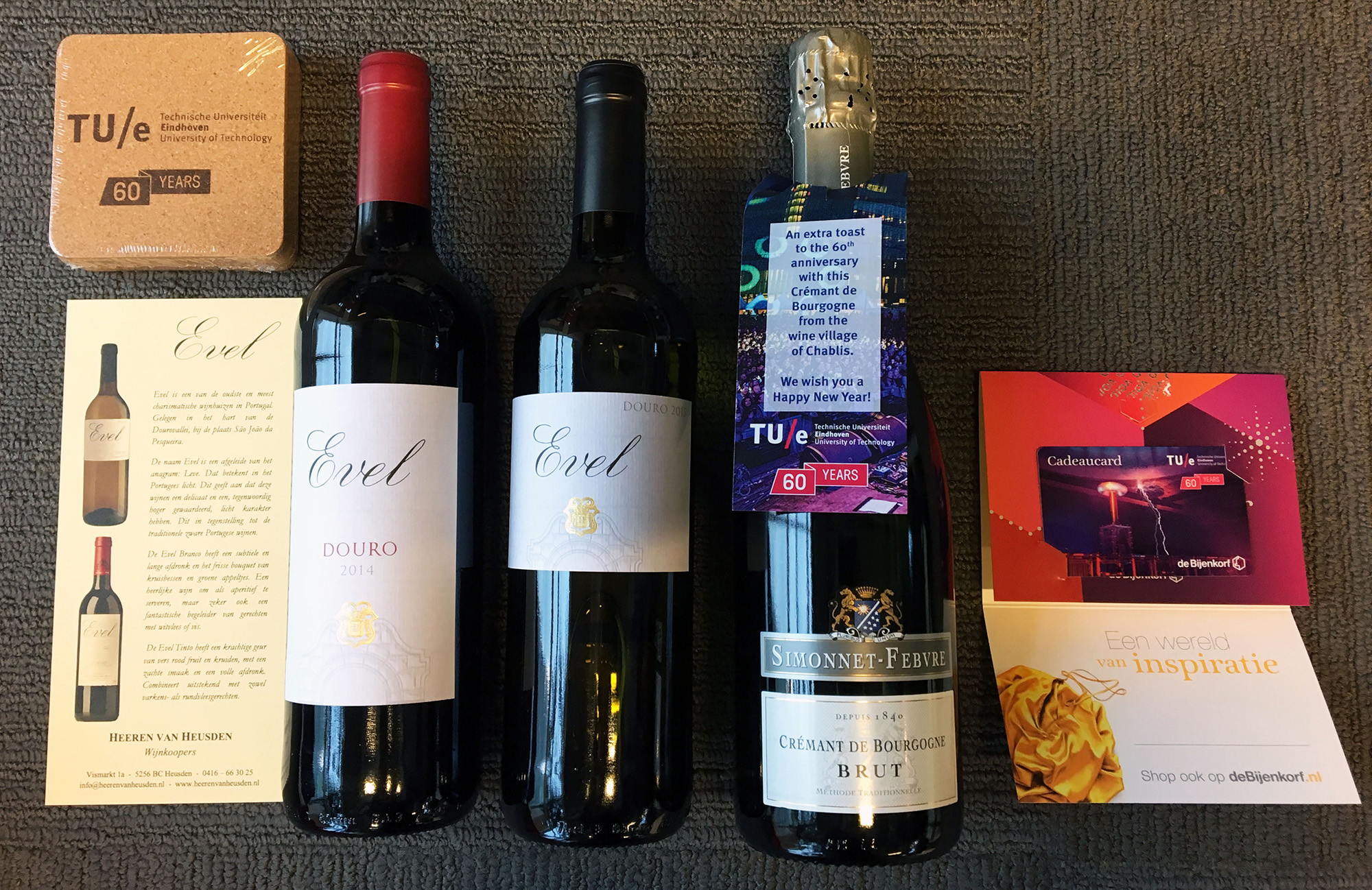 According to Cursor, TU Eindhoven has gone for traditional: “Not only did TU/e celebrate its 60th Anniversary in April, the uni also had one success after the other throughout the year (what’s new?), Executive Board President, Jan Mengelers said in his end of year thank-you speech. All this needed celebrating, so this year the Christmas parcel doesn’t have just two, but three bottles: a red and white Portuguese duo and a sparkling Crémant de Bourgogne to drink away the increasing workload and sustain that lustrum party joy to the bitter end. We don’t want to be very posh about this, but personally we find the TU/e wines generally a little flat-tasting. That’s why we’re looking forward to spending the annual Bijenkorf gift card on something that we certainly don’t need, but that still feels like a nice (and free) overindulgence. But those ‘60 years’ cork coasters: hmph.”