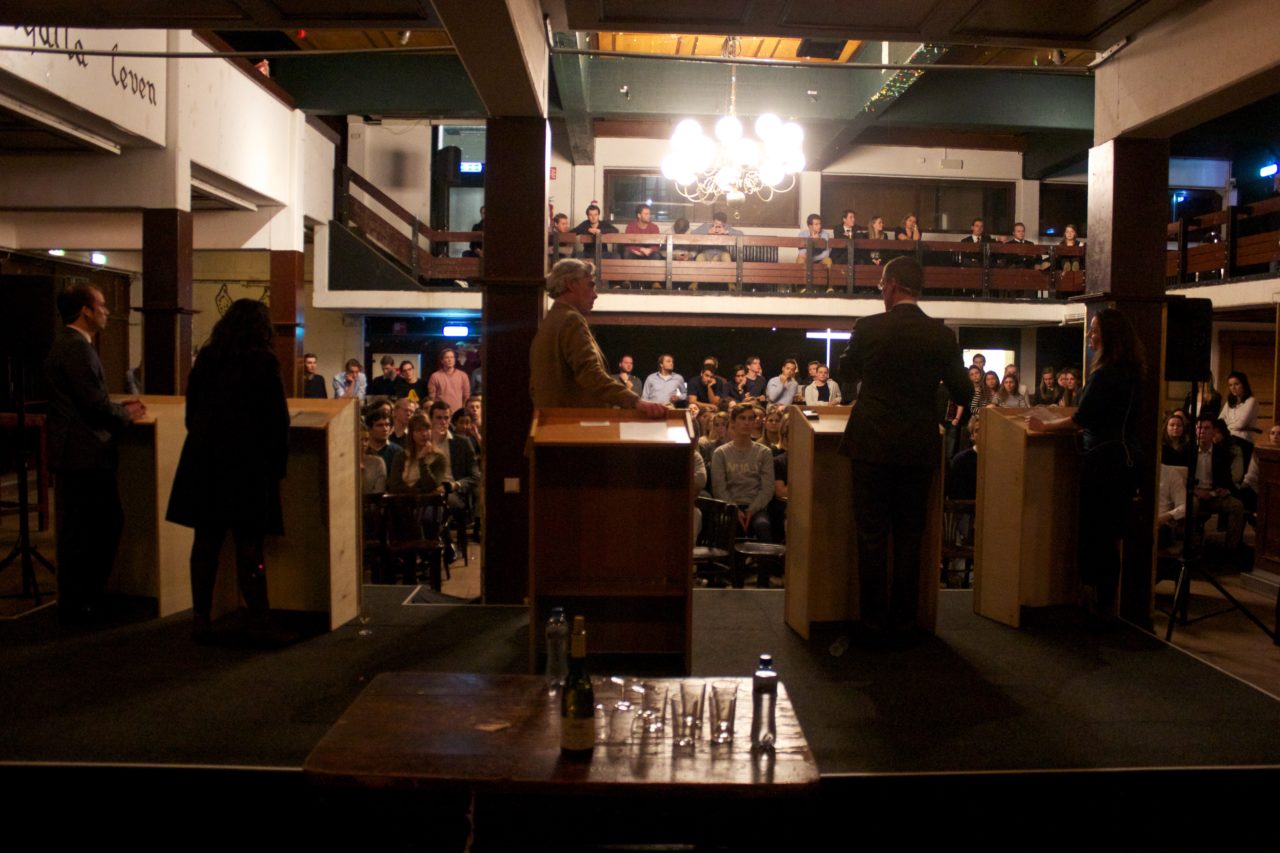Under the chairmanship of Professor Wiep van Bunge, the representatives presented their cases from the wobbly stage of the cosy members’ club. Dressed in student-like attire, the audience of about 150 looked on.