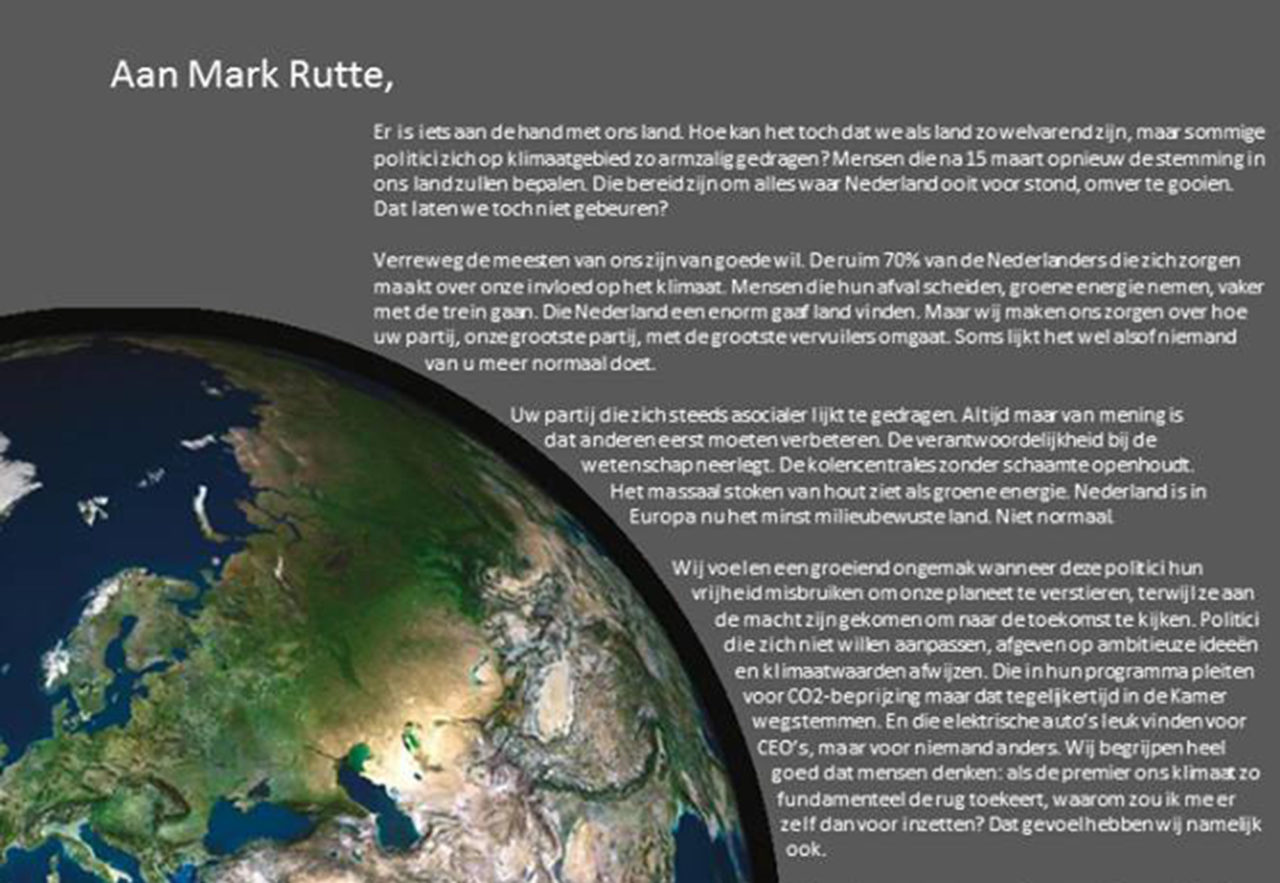 Inspired by Rutte’s open letter in the national newspapers at the end of January, Jurriaan Wesselink and Tsjip van Hulst decided to reply to the Prime Minister. Rutte’s anxieties about the loss of a Dutch identity were replaced by their worries about the climate. “We have an increasing sense of unease when these politicians abuse their freedom to spoil our planet, while they’ve come to power to be responsible for the future. Politicians who do not want to adapt, run down ambitious ideas and reject climate values.”