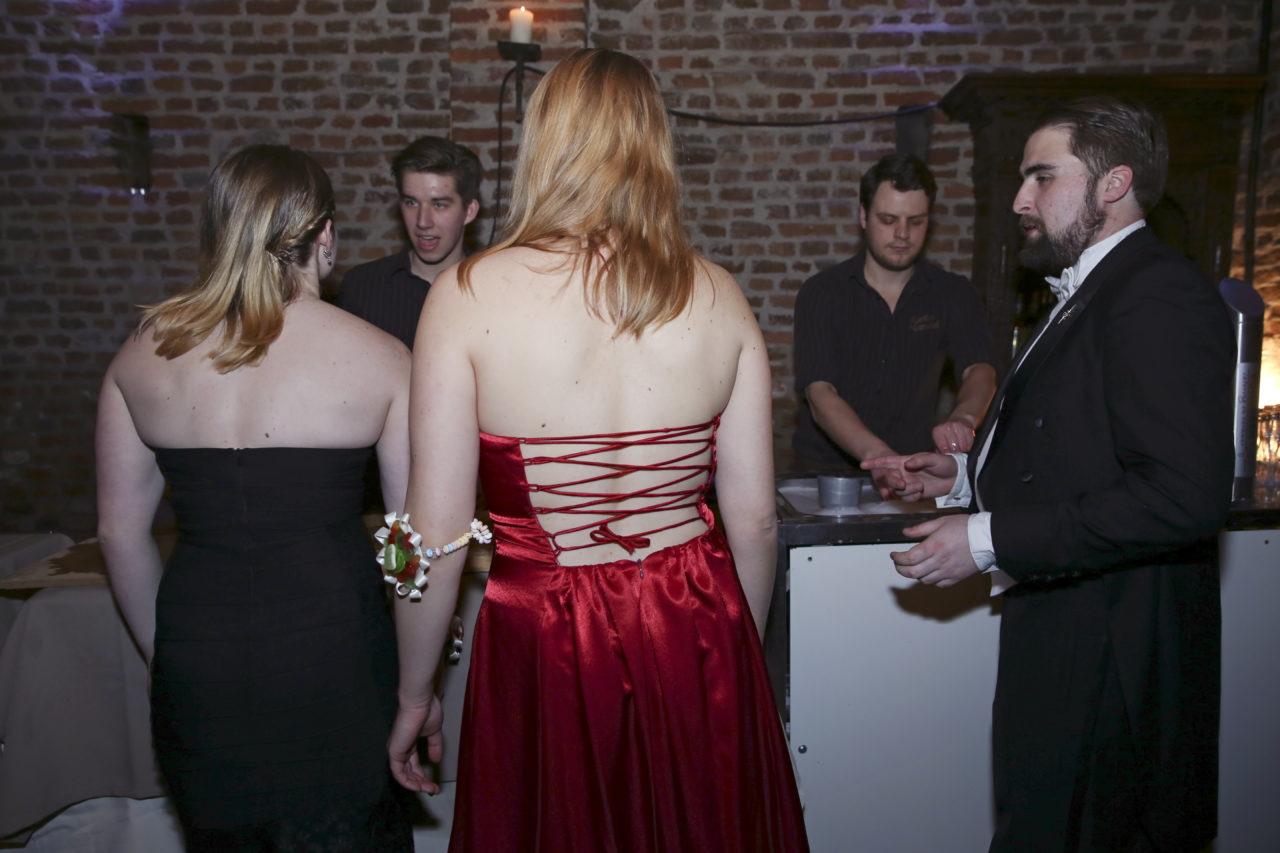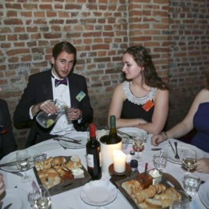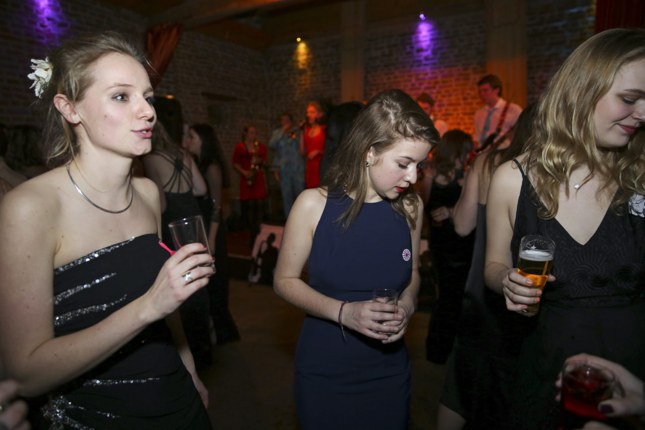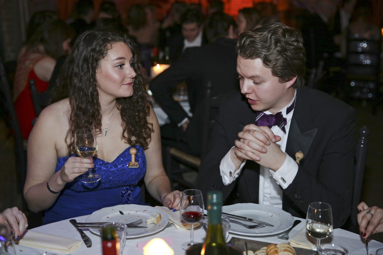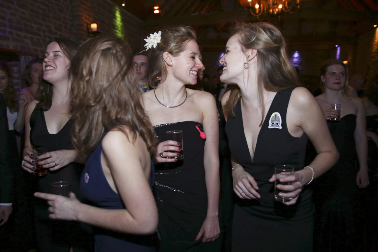 It remains to be seen whether dress length is indeed a predictor of outcome. Be that as it may, the beautiful long dresses of the ladies immediately catch the eye during the first tour of the dining room, where the sixty students are enjoying – very quietly, it must be noted – a three‑course dinner. The attire of the ladies makes it possible for a few gentlemen to immediately distinguish themselves as knights in shining armour. “My dress is ten centimetres too long”, Jojanneke explains while her date Toine sits next to her on the ground with a handful of safety pins. “Fortunately, he’s come to my rescue.”
